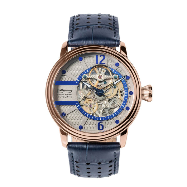 Built from the finest materials and utilizing an intricate skeleton self-winding automatic movement; this innovative new addition to the Daniel Steiger collection exudes elegance and luxury. A beautiful skeleton face automatically powers this spectacular looking watch, working effortlessly away under durable case and attached to the wrist by a luxurious genuine leather strap. This beautiful watch provides a true look of style and sophistication; which color will you choose?