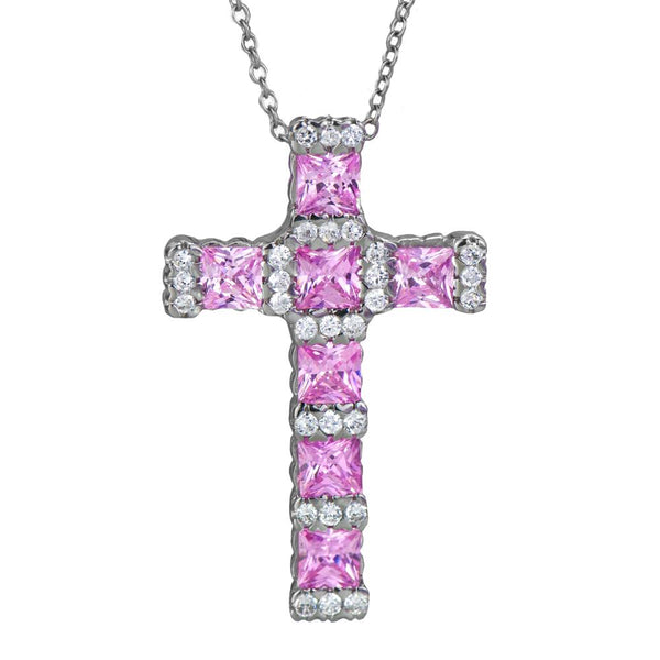 Whoever is lucky enough to receive this charming cross, will definitely be pretty in pink. Mined Pink Diamonds are of course one of Mother Natures greatest not to mention most expensive treasures. This delightful piece would definitely need its own security guard. Luckily we have access to a consignment of triple A grade Diamondeau® - flawless simulated diamonds in a sophisticated Pink Blush color. 5 carats of these magnificent Princess cut gems are set in mounts of the finest 925 solid sterling silver and are accented with 30 of our brilliant white Diamondeau® - flawless simulated diamonds for extra sparkle.