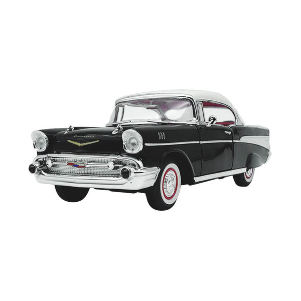 Step back in time and experience the timeless elegance of the 1957 Chevy Bel Air in black with white top. This 1:18 scale, die cast model features openable doors and hood and showcases the small block V-8 engine. Intricate interior detailing adds to its allure. Gleaming chrome bumpers, grill and trim, paired with the unmistakable soaring tailfins, capture the essence of the ’57 Bel Air’s design. Enhanced by smooth rolling rubber tires and steering wheel controlled front wheels.