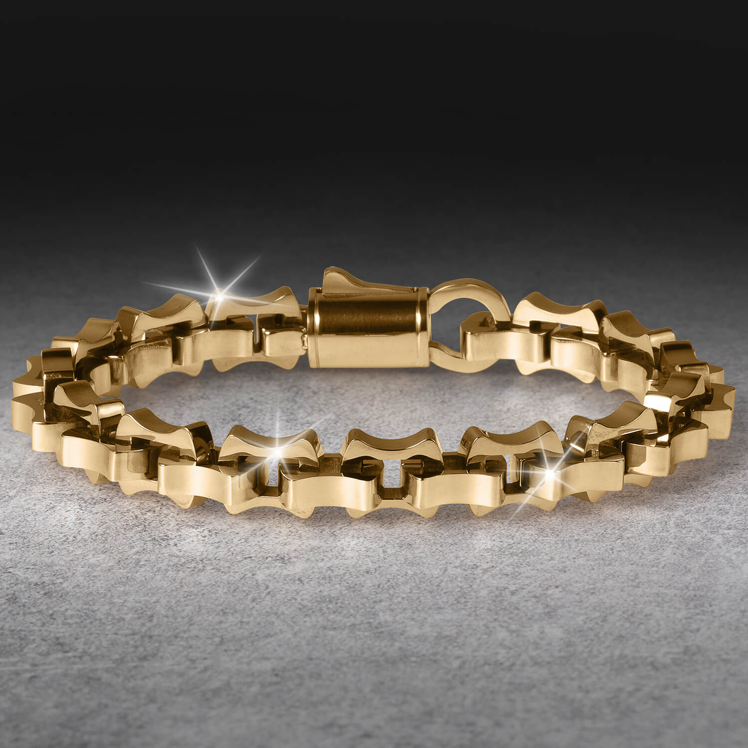 This bracelet makes an everyday accessory that gives you an air of refined glamour. Premium grade stainless steel links have been lavishly plated in yellow gold. The unique chunky links of this bracelet are sure to garner plenty of compliments wherever you go.