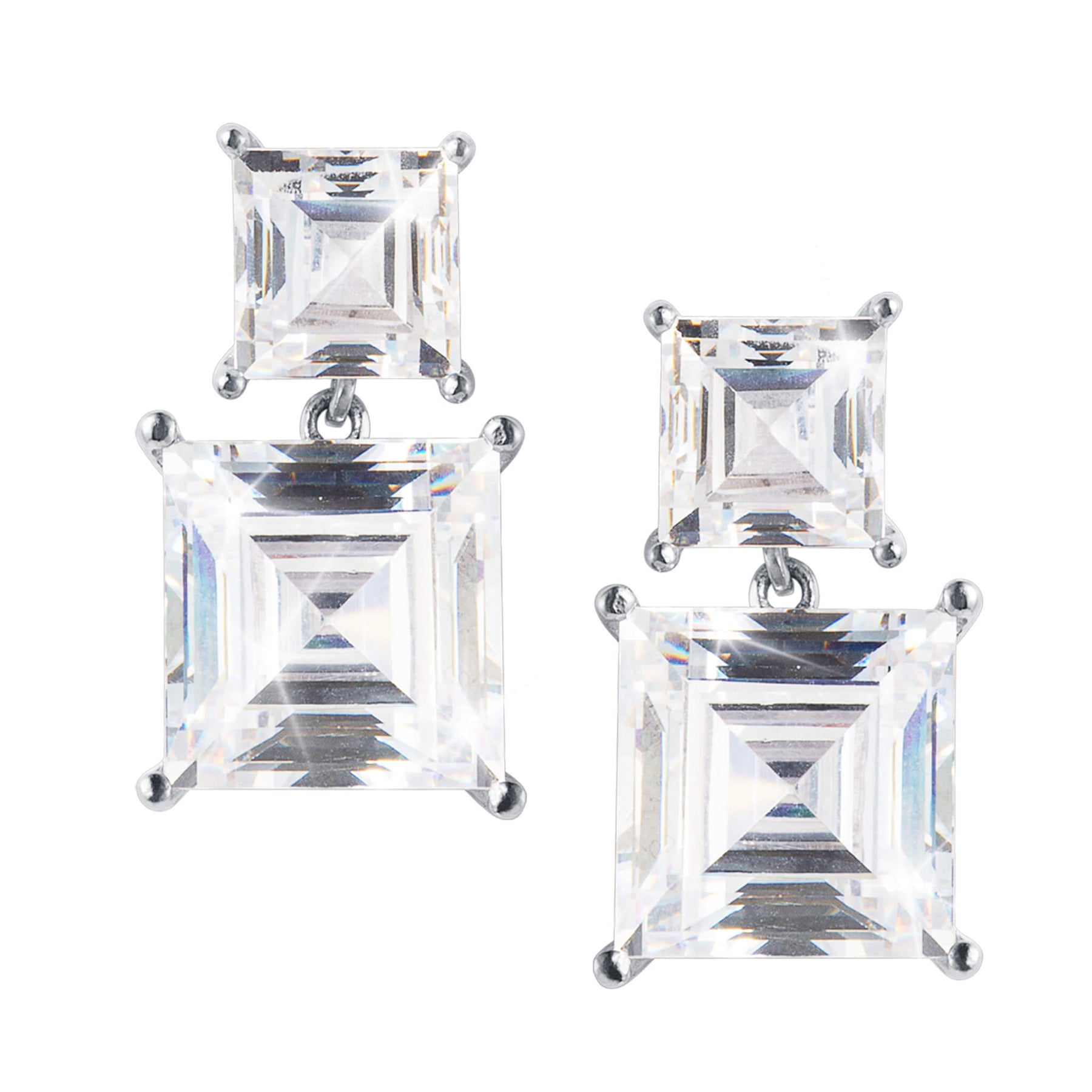 Expertly crafted from sterling silver and beautifully polished, these earrings are as striking as they are elegant. A double Princess cut Diamondeau®, flawless simulated diamond, in just the right believable size, makes a dazzling statement. Prepare to make a bold statement
