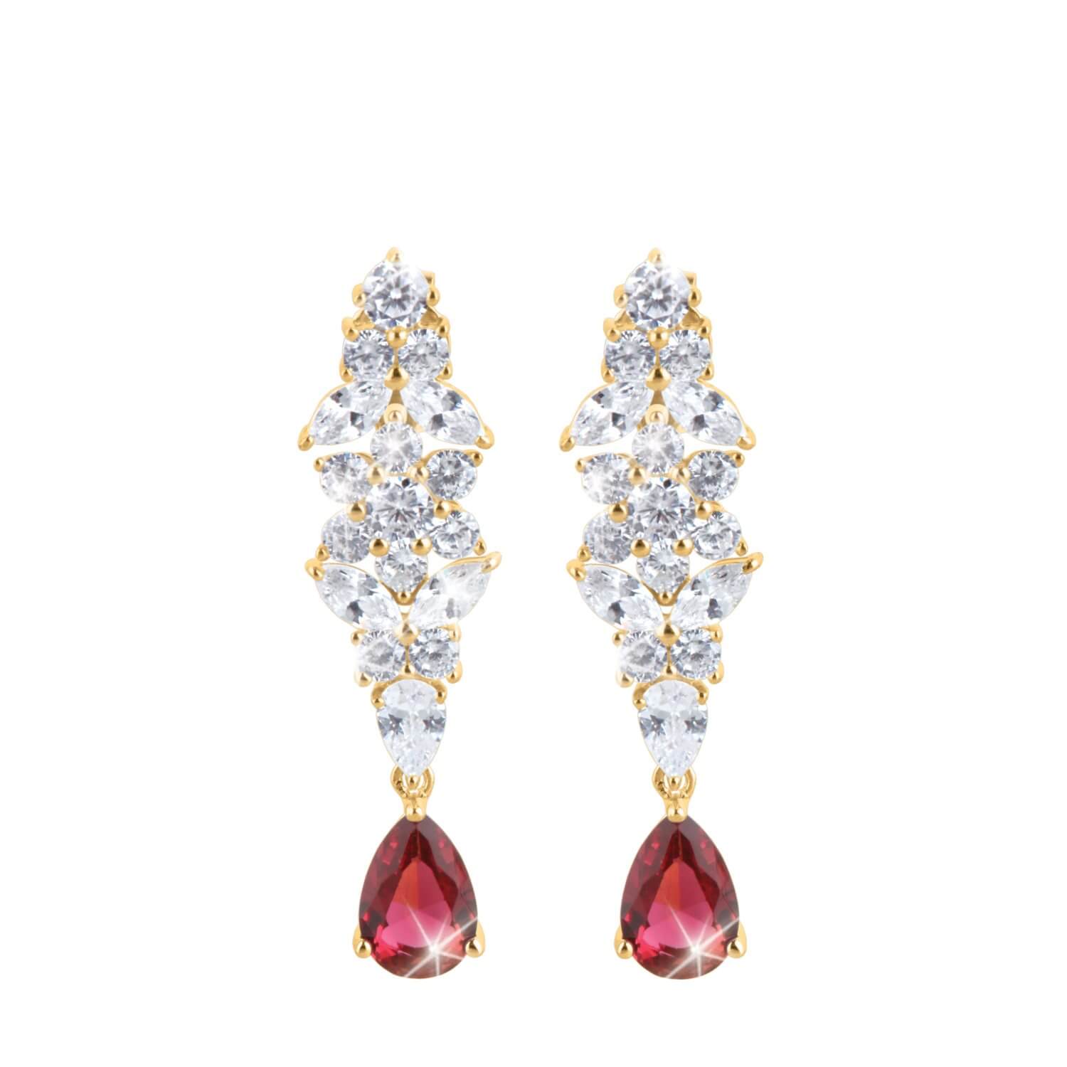 Clusters of marquise, round and pear brilliant white Diamondeau® - flawless simulated diamond capture a hidden flower in the middle of this design. This piece sparkles in a pleasing fashion as it flows down the elongated design to reveal an opulent rich red pear drop Diamondeau® - flawless simulated diamond. Crafted in sterling silver and plated in sumptuous yellow gold. These elegant earrings will instantly update your look