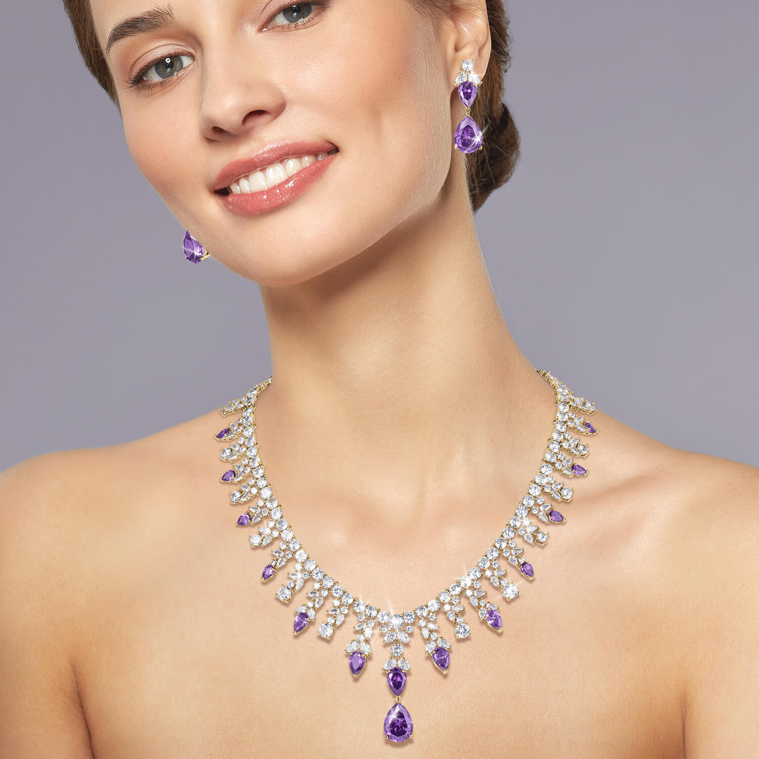 Indulge yourself in this shimmering bonanza. These earrings ooze style and sophistication and are sure to make you stand out in a crowd. The mount is expertly set with shimmering, deep regal purple and ice white Diamondeau®, flawless simulated diamond. The earrings are given a truly decadent feel with a glimmering golden finish. Complete the look with the matching necklace making you statement ready for the festive season.