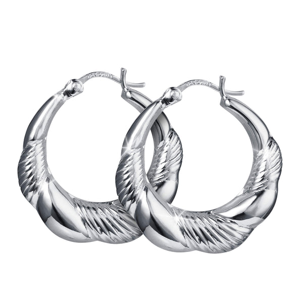 An amazing pair of sterling silver earrings with their own unique style and elegance, perfect to make a bold statement. Patterned creoles with intricate detailing etched into sterling silver creates a mesmerizing effect.  These earrings are lasting and make a great investment piece. The high-quality sterling silver ensures they shine for years to come, allowing you to wear them for any special occasion.