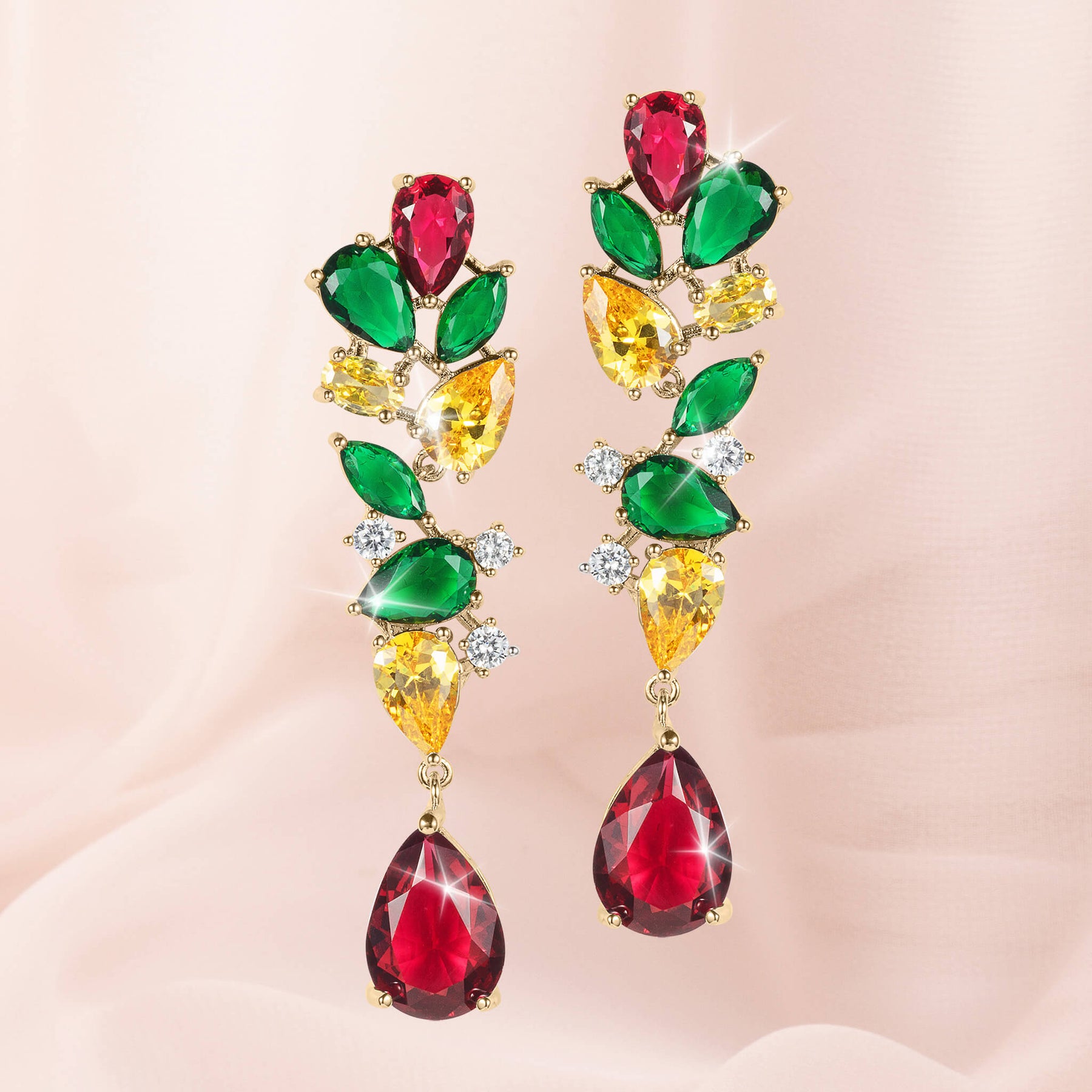 Crafted in radiant yellow gold, these exquisite earrings embody the captivating brilliance of a tropical sunset over lush landscapes. Featuring Diamondeau®, flawless simulated diamond stones in vivid shades of yellow, red, green, and clear, the design is brought to life with bold red pear-cut centerpieces that radiate warmth and sophistication. Offering a dazzling burst of color and luxury, these earrings are perfect for any occasion. Wear them for a luxurious yet playful look that transitions seamlessly from day to night.