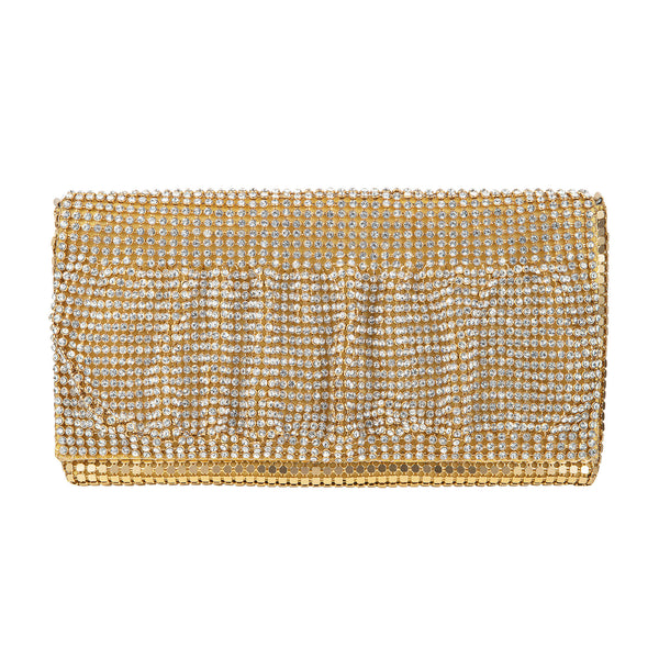 With the party season fast approaching that special party outfit could do with some new accesories to give it a lift. Our ruffle clutch is the height of glamour, we have used a special golden metal chainmail for the back whilst the front is a rouched web cover embedded with hundred of sparkling crystals. A shoulder chain is concealed in the satin lining. Why not add the cute matching coin wallet to your order for a co-ordinated look?