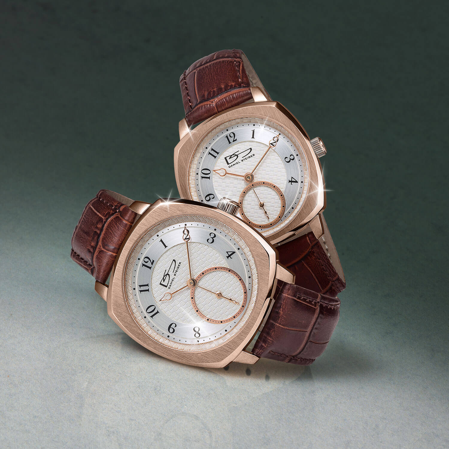 These watches have it all! Starting with the case we have used only the best stainless steel. A bezel in steel or fused with IP rose gold has been given a mixture of matte and polished finishes. A textured cross hatch dial with a two hand movement and second hand sub dial gives an elegant but classic feel. A genuine croc leather strap in blue or brown completes this timepiece. Brought to you in the matching pair, men’s and ladies, the ideal accessory for the festive season.