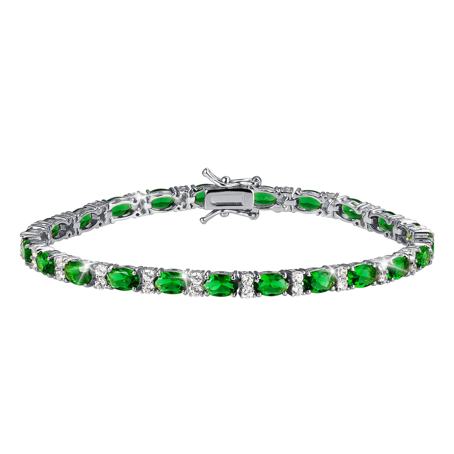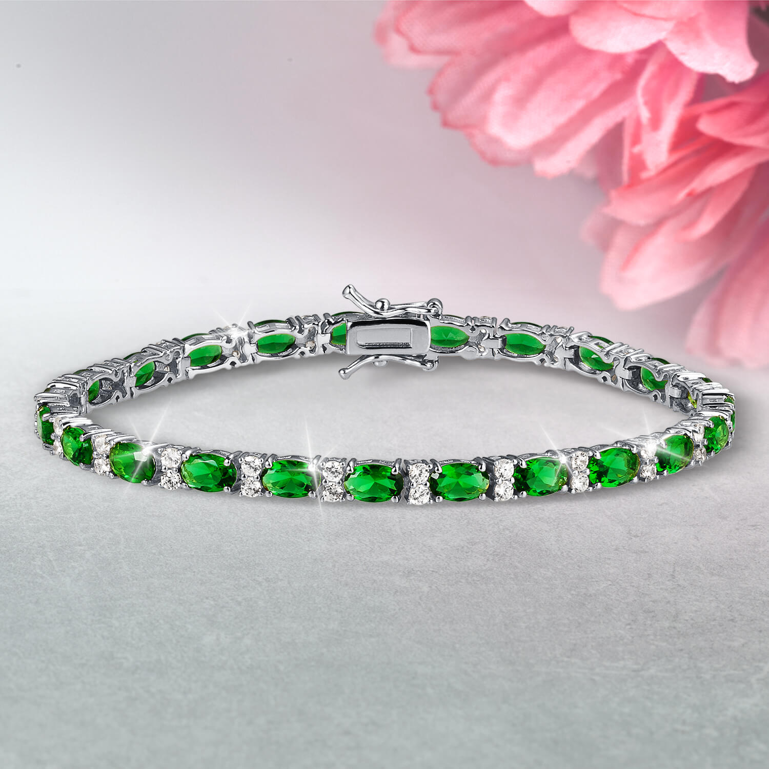 Elegantly designed with a perfect blend of contemporary and modern design. Finely crafted from sterling silver. Oval shimmering green Diamondeau®, flawless simulated diamond, are complimented either side by white brilliant round cut gems. This beautiful bracelet is one that will add an element of uniqueness to any outfit