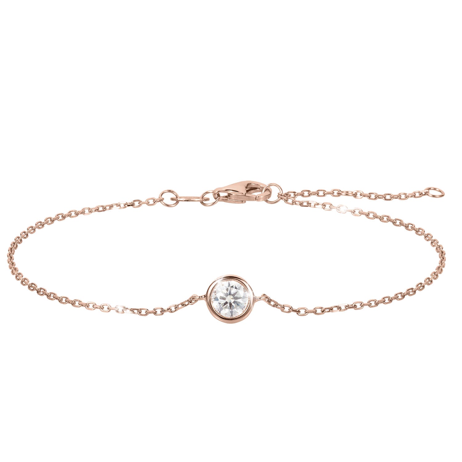 Rich in beauty, this rose gold plated bracelet will make you the envy of all. Finely crafted from sterling silver with a soft rose gold finish. Each item is bezel set with a stunning Moissanite round stone. Moissanite considered "the most brilliant jewel on Earth", this uniquely created gemstone is the ultimate in affordable luxury. Discovered by Henri Moissan in 1893, this gem outshines any diamond with its greater sparkle and is sure to make a dazzling statement.