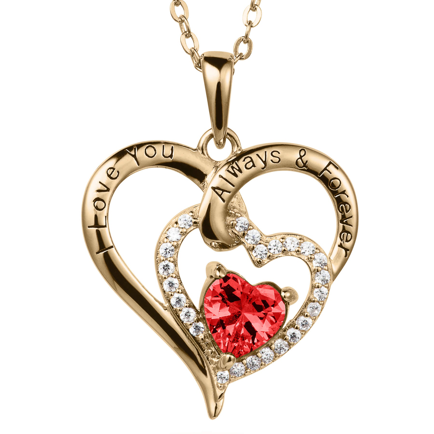 A beautifully crafted symbol of everlasting love. This elegant pendant features two interlinked hearts in sterling silver with a warm yellow gold finish, each curve and connection representing the bond that holds you close. The heartfelt engraving, “ I love you always and forever, “ is a timeless message of devotion, perfectly complemented by a deep red heart- shaped Diamondeau®, flawless simulated diamond stone, adding a striking touch of color. Whether for a loved one or a meaningful piece for yourself, this pendant is a treasured reminder of love that endures.