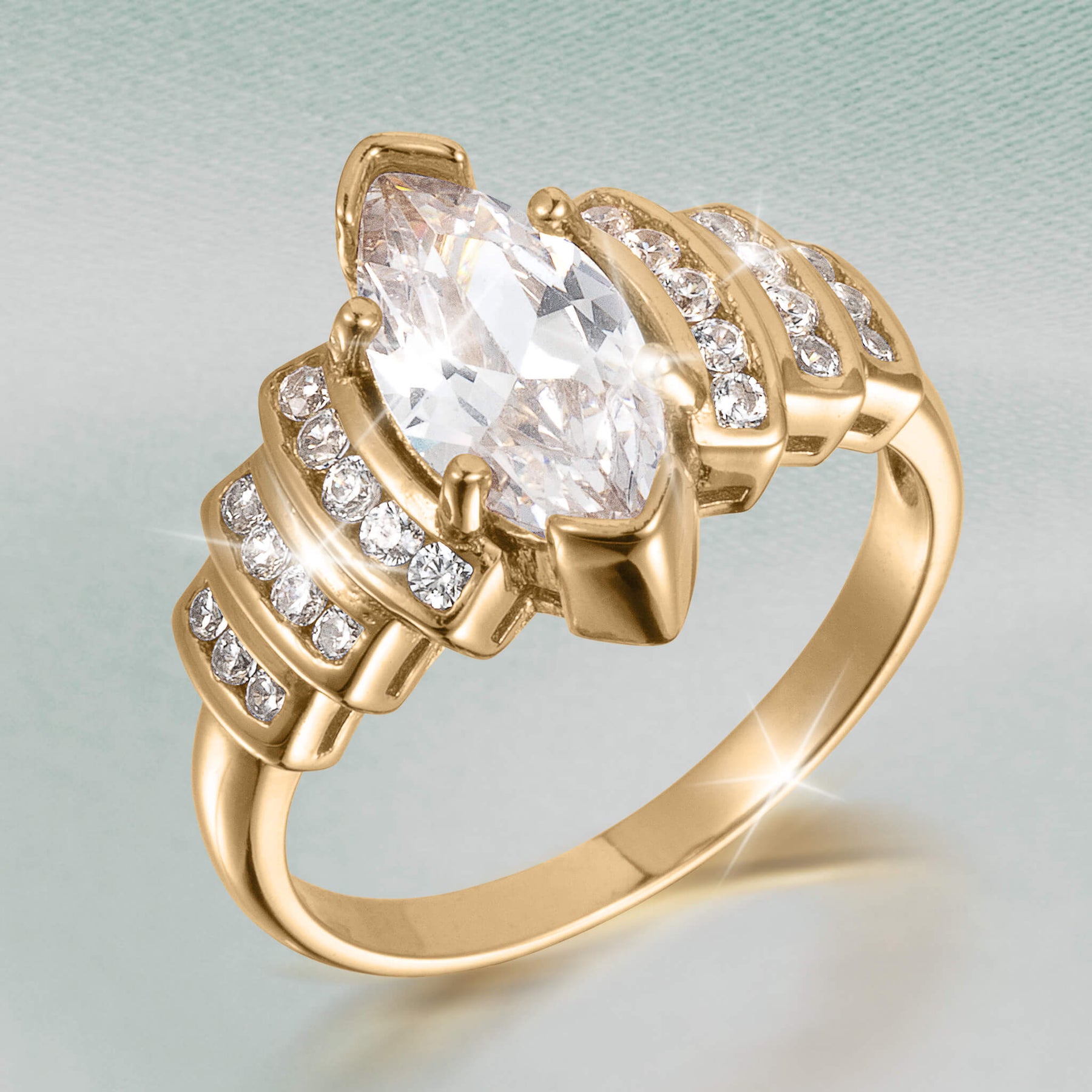 Radiating timeless glamor, this ladies sterling silver ring is beautifully finished in a rich yellow gold tone, offering the perfect balance of classic elegance and modern sparkle. At its center sits a dazzling marquise-cut Diamondeau®, flawless simulated diamond, expertly faceted to reflect light with breathtaking brilliance. The bold yet graceful band is adorned with more rows of shimmering pavé-set Diamondeau® adding depth, texture, and an unmistakable touch of luxury. Crafted from high-quality sterling silver, this ring delivers lasting beauty with a radiant gold-finished glow.