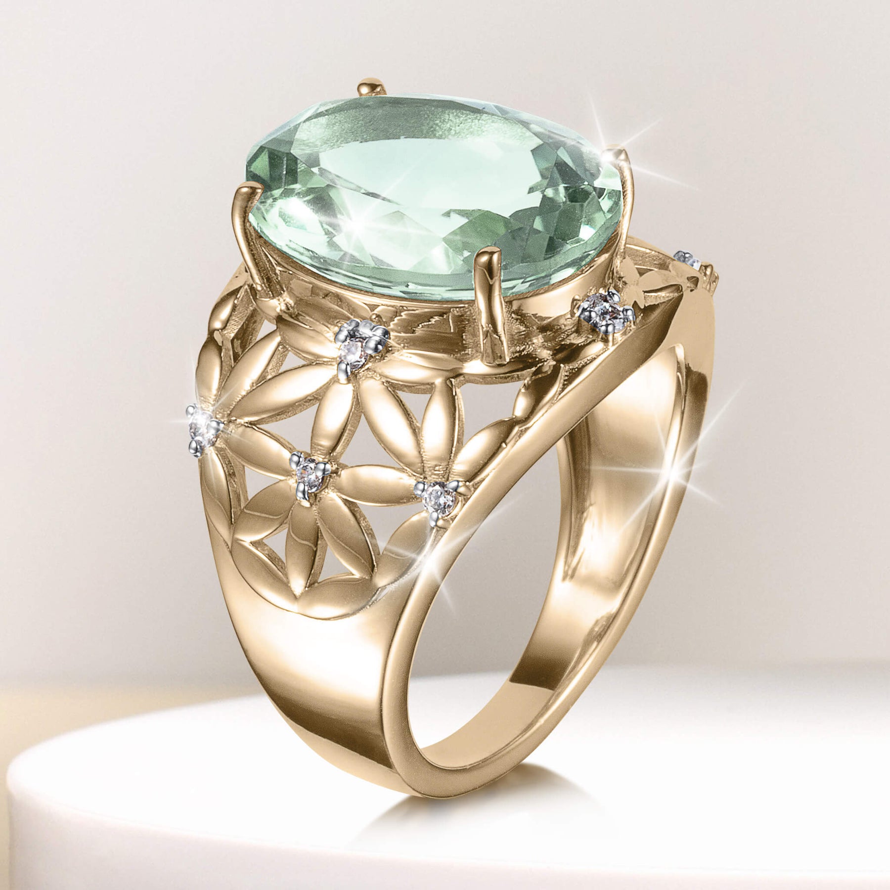 Designed with precision, this exquisite ring is the perfect fusion of timeless beauty and radiant sparkle. Crafted in sterling silver with a luminous 18k yellow gold finish, it showcases an oval-cut green Amethyst embraced by golden floral details. The radiant gold setting is further enhanced by the subtle sparkle of Diamondeau®, flawless simulated diamond stones, adding a touch of refined luxury. The harmonious blend of serene green and warm gold exudes sophistication, capturing the essence of elegance in every detail. A true testament to artistry and craftsmanship, this ring brings nature’s essence to life in a timeless design.