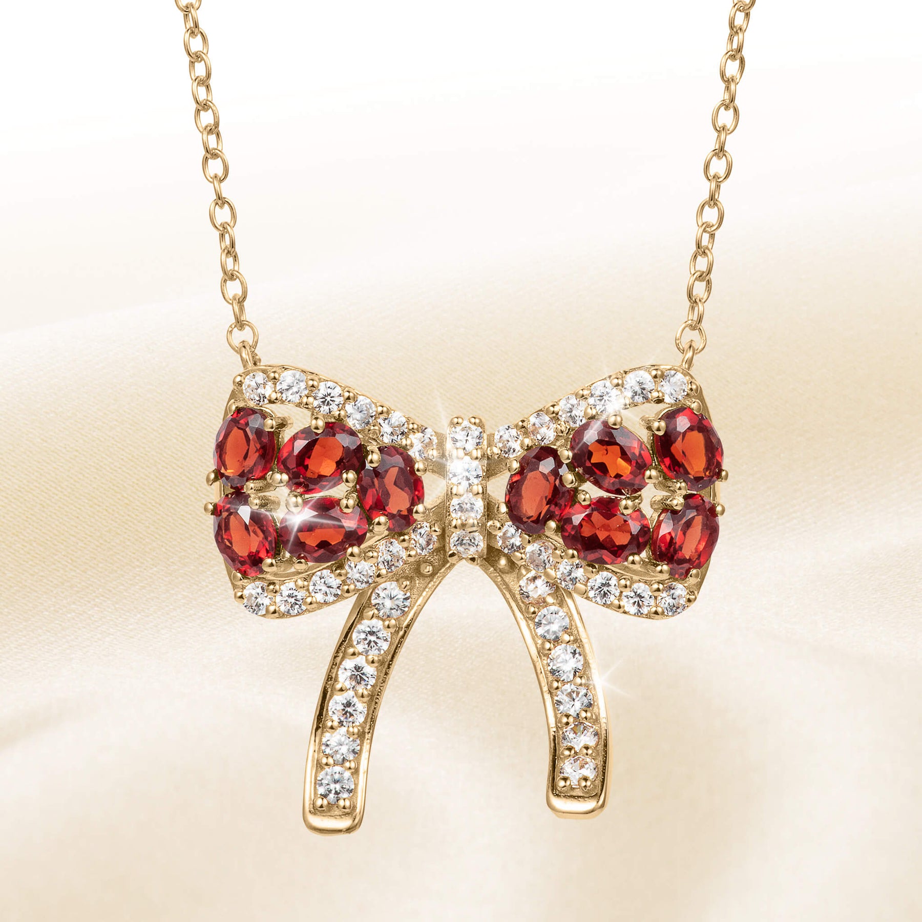 Celebrate sophistication with this exquisite bow pendant, a symbol of grace and charm. Adorned with lustrous deep red garnets, each faceted to capture the light, this pendant shimmers with sparkling Diamondeau® - flawless simulated diamonds that trace the contours of the bow, adding breathtaking brilliance. Crafted from sterling silver with a  luxurious gold-tone finish, the intricate design balances vintage allure with modern elegance, making it the perfect statement piece for any occasion.