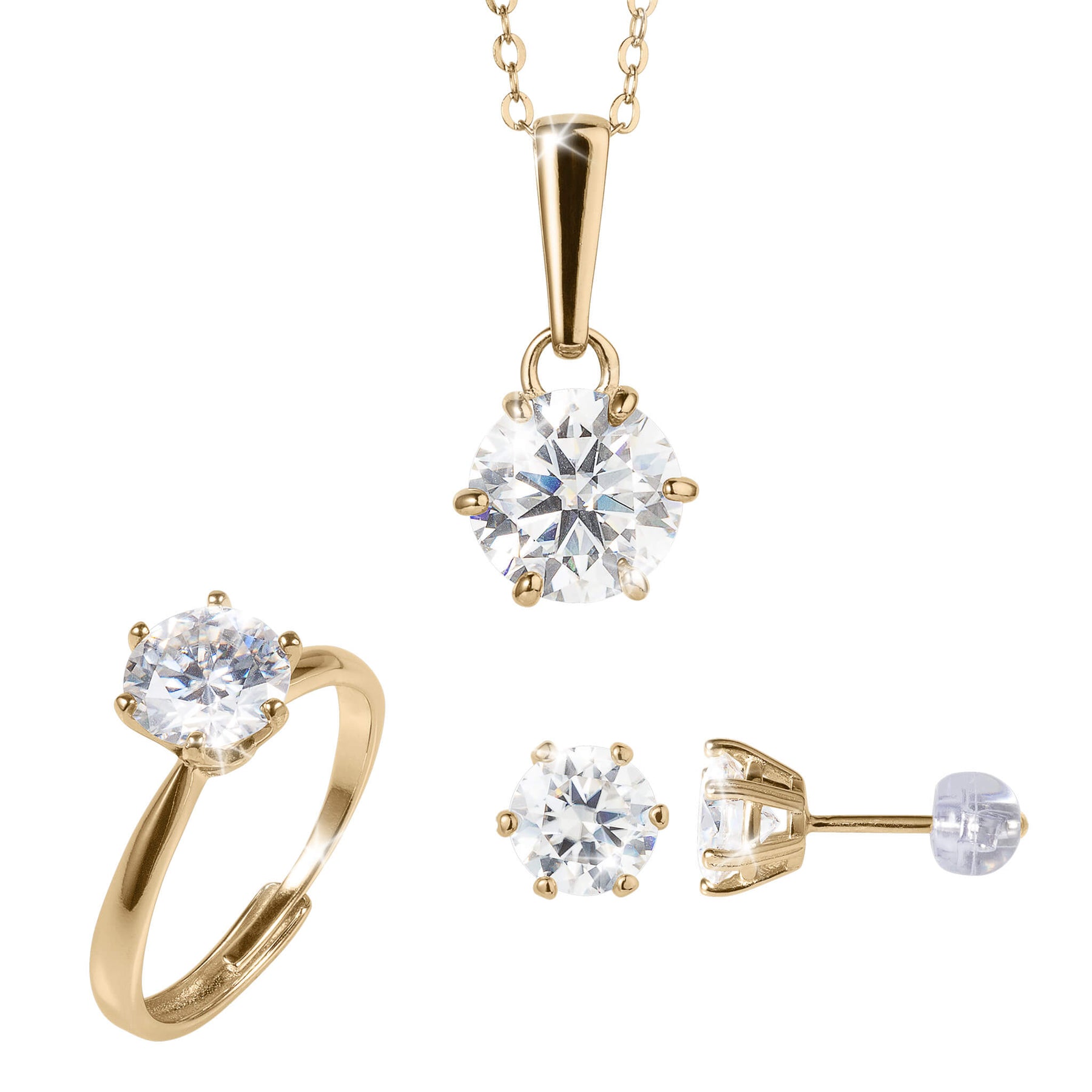 Own a collection that has unrivalled beauty, more fire, more brilliance and more luster than a Diamond. Moissanite was discovered by Henri Moissan in a crater in Arizona in 1893. It is said to be a gemstone born from the stars, because it was formed by a meteorite that had fallen to earth. This dazzling 3 piece collection is finely crafted from sterling silver and finished in warm yellow gold, handset with a solitaire Moissanite, the ring is adjustable giving you freedom to change the finger you wish to wear the ring on. This exceptional collection draws all the attention to the center stone for its refinement and sheer brilliance.