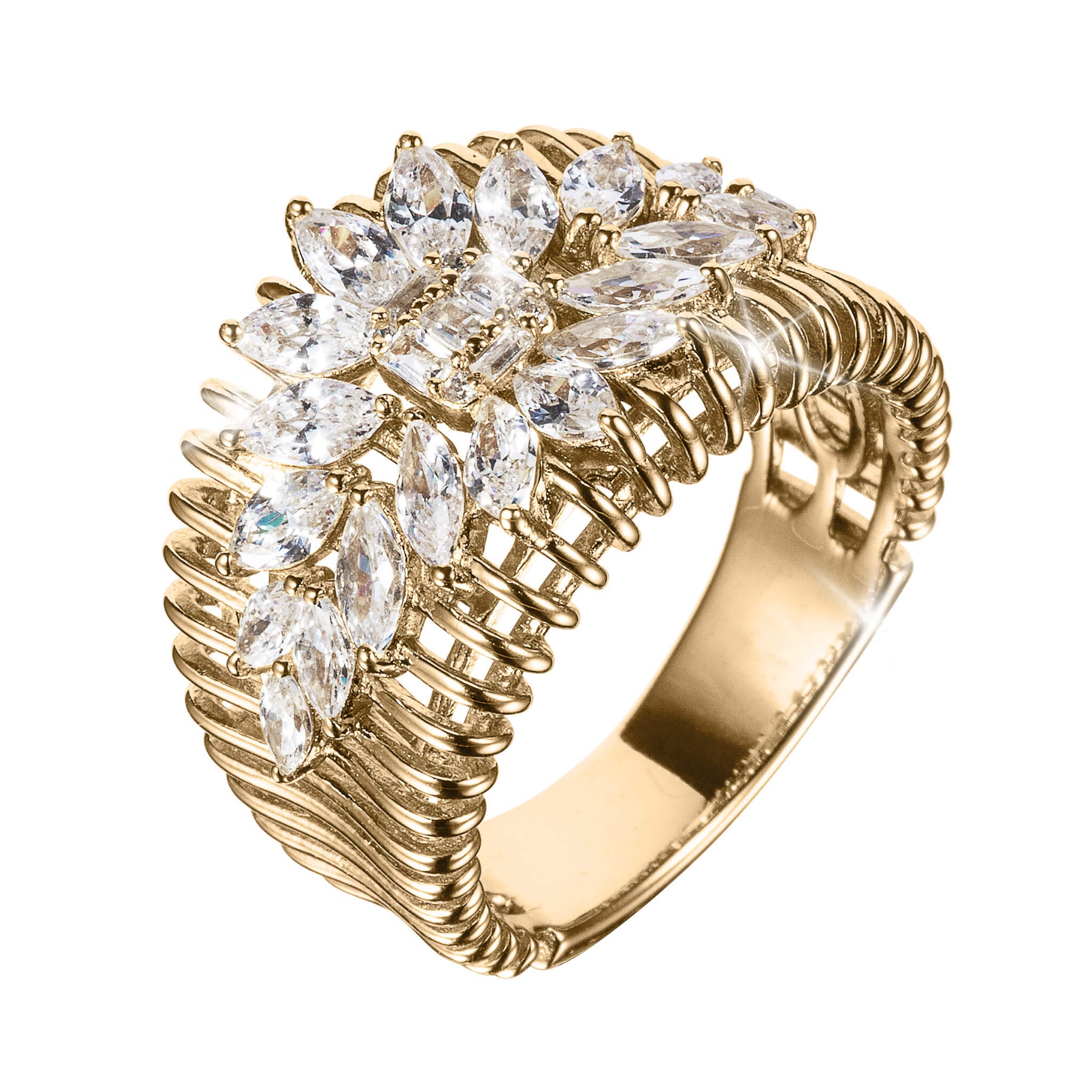 Adorn your hand with a captivating piece that delivers a striking statement of contemporary luxury. Crafted from sterling silver and finished in luxurious yellow gold, this ring showcases a stunning floral design. The marquise-cut Diamondeau®, flawless simulated diamond petals surround a central cluster of dazzling stones, creating a sunburst of brilliance. The wide band, with its distinctive textured gold ribbed design, provides a bold foundation, enhancing the ring's sculptural and contemporary aesthetic. Perfect for adding a touch of glamour to any occasion, this ring is a testament to modern sophistication redefined.