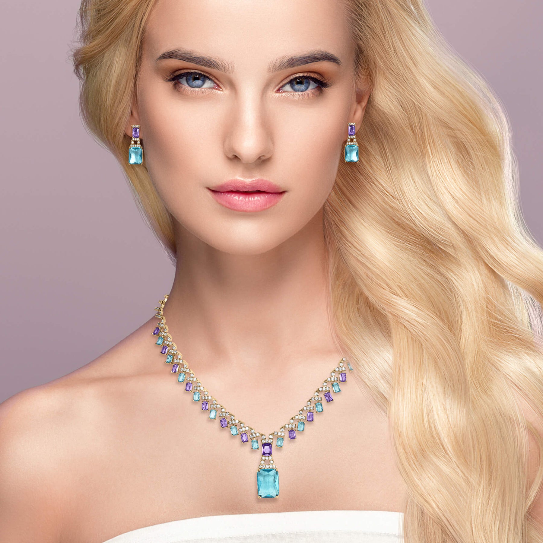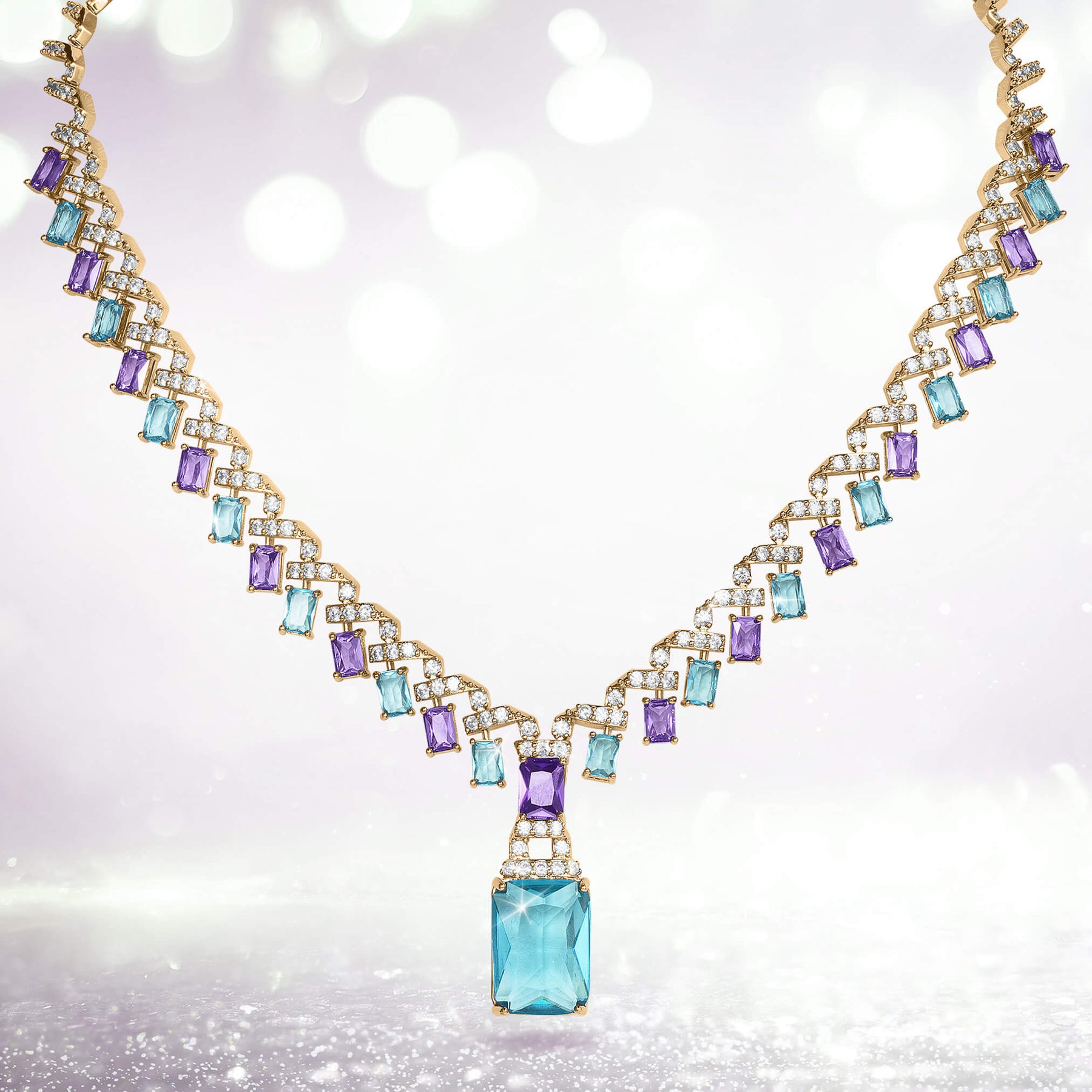 A breathtaking ladies necklace. This piece is designed to captivate and enchant, finished in opulent yellow gold. The statement necklace is adorned in stunning emerald-cut stones in a shade of regal purple and serene light blue, each exuding an aura of grace and beauty. Interspersed among them are shimmering white Diamondeau®, flawless simulated diamond adding an extra touch of sparkle and brilliance.