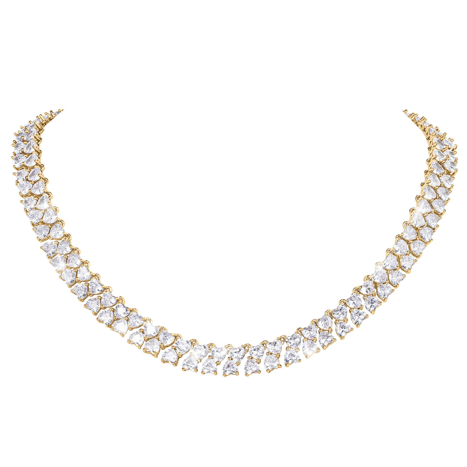 Celebrate Valentine's Day this year with the gift of love in the form of this stunning heart collection. A double row of sparkling white heart shaped Diamondeau®, flawless simulated diamond are encrusted along the entirety of this necklace. Matching drop earrings complete the collection which is luxuriously finished in yellow gold. The ideal gift she will enjoy all year long.