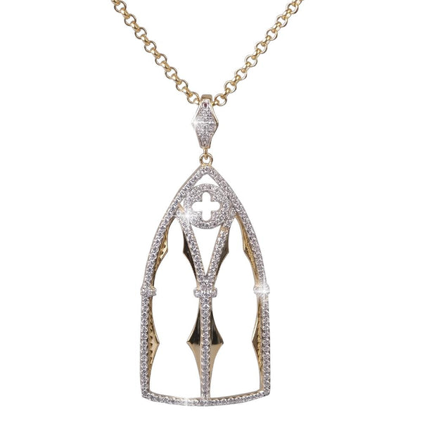 Westminster Abbey has been the venue for many a Royal wedding but is also visited each year by millions of tourists that gaze in awe at the beautiful windows and carvings. It was these ancient architectural details that inspired our unique Abbey Collection. Solid 925 Sterling settings in the shape of spectacular stained glass windows are plated with luxurious 18k Yellow Gold before being set with over 400 of our flawless Diamondeau® - flawless simulated diamond. Own a little piece of history, pendant includes matching 18" chain, magnificent presentation case dispatches with each piece.