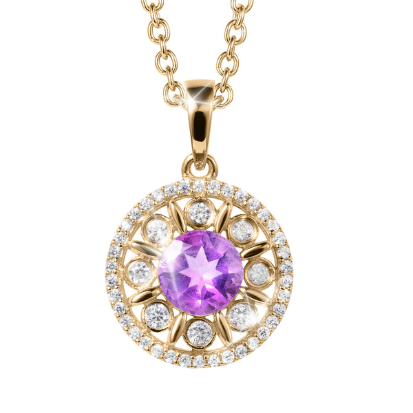 A celebration of nature’s beauty and timeless elegance. The focal point of this pendant is a meticulously crafted floral mount, expertly fashioned from sterling silver, finished in lustrous 18k yellow gold. At the heart of this botanical masterpiece lies a captivating Amethyst, surrounding this regal purple stone is a delicate dance of sparkling Diamondeau®, flawless simulated diamond. A harmonious blend of sophistication and femininity.
