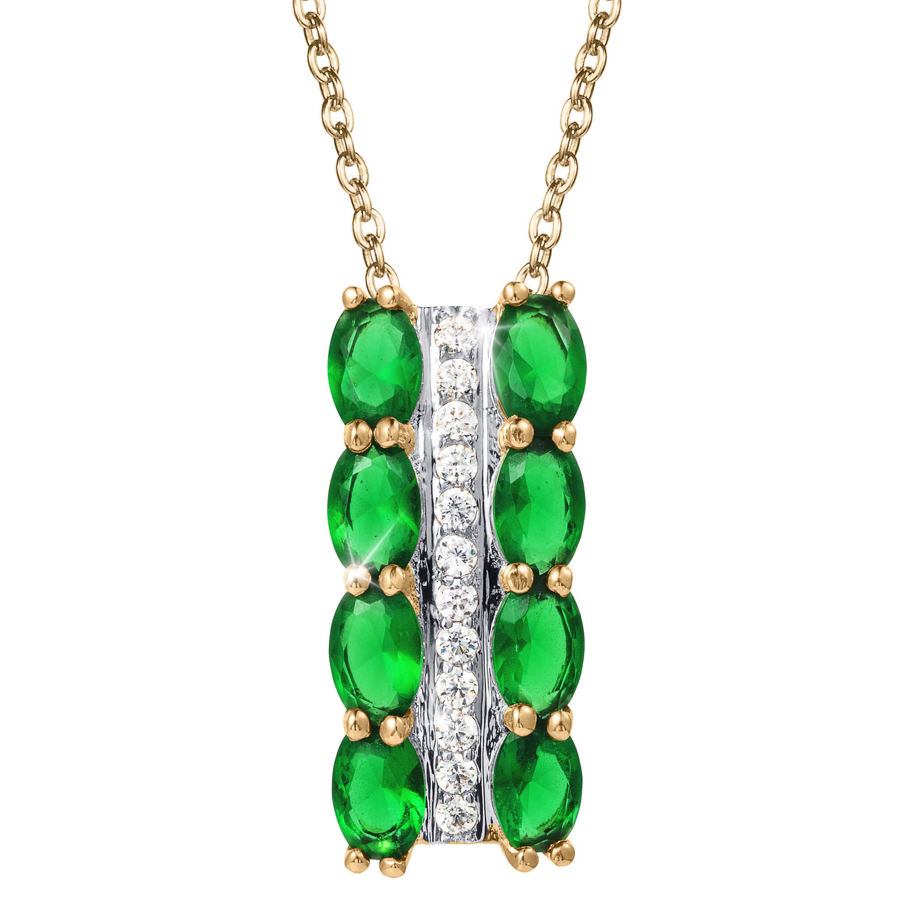 Glittering and incredibly glamorous, this gorgeous pendant features shimmering oval evergreen gems with added shimmering ice white Diamondeau®, flawless simulated diamond. Fashioned from sterling silver, gloriously plated in golden yellow gold. The ideal shimmering centerpiece for any occasion.