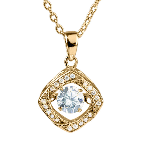 The setting is a pioneering concept. Featuring a patented design allowing the feature stone to vibrate, creating a consistent shimmering of fire and brilliance. The Diamondeau® - flawless simulated diamond are handset at precise angles which enable continuous movement of the center stone with every movement she makes. Capture her movements, Capture her heart....