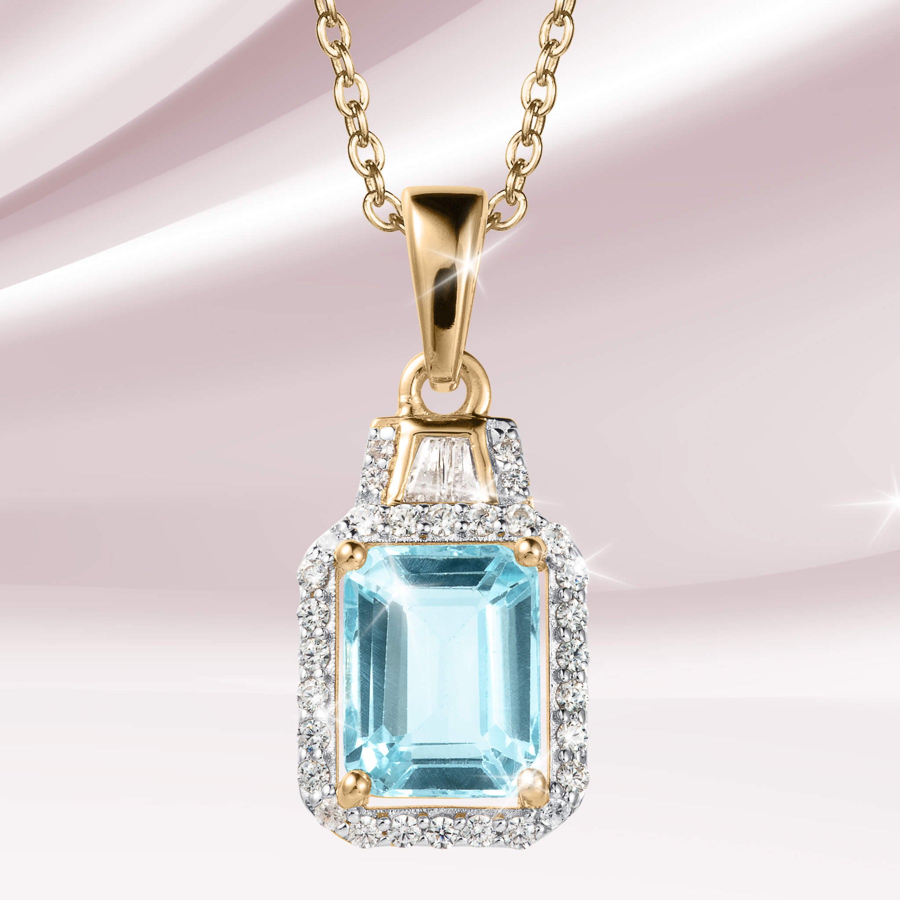 Elevate your style with this enchanting pendant that exudes timeless elegance. Crafted in sterling silver and finished with 18k yellow gold, this exquisite piece captures the essence of refined luxury. A dazzling emerald-cut Sky Blue Topaz gemstone takes center stage, framed by a halo of brilliant Diamondeau® flawless simulated diamond stones. Tapered baguette accents add an extra layer of sophistication, evoking the opulent artistry of the Art Deco era. Suspended from a delicate chain, this pendant is a radiant statement of grace and beauty.