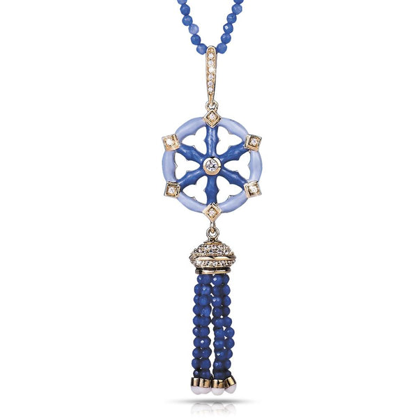 Faceted beads of the most gorgeous Azure Marine Quartz are hand strung to create the necklace and fashionable tassels on each piece. We have of course used only the finest 925 solid Sterling Silver layered with a plating of extravagant 18k Yellow Gold. The nautical wheel medallion has been skilfully embellished with artisan enamel in shades of sky and ocean blue and each pieces is intricately set with dozens of our flawless Diamondeau® - flawless simulated diamonds. Magnificent presentation case included with each order.