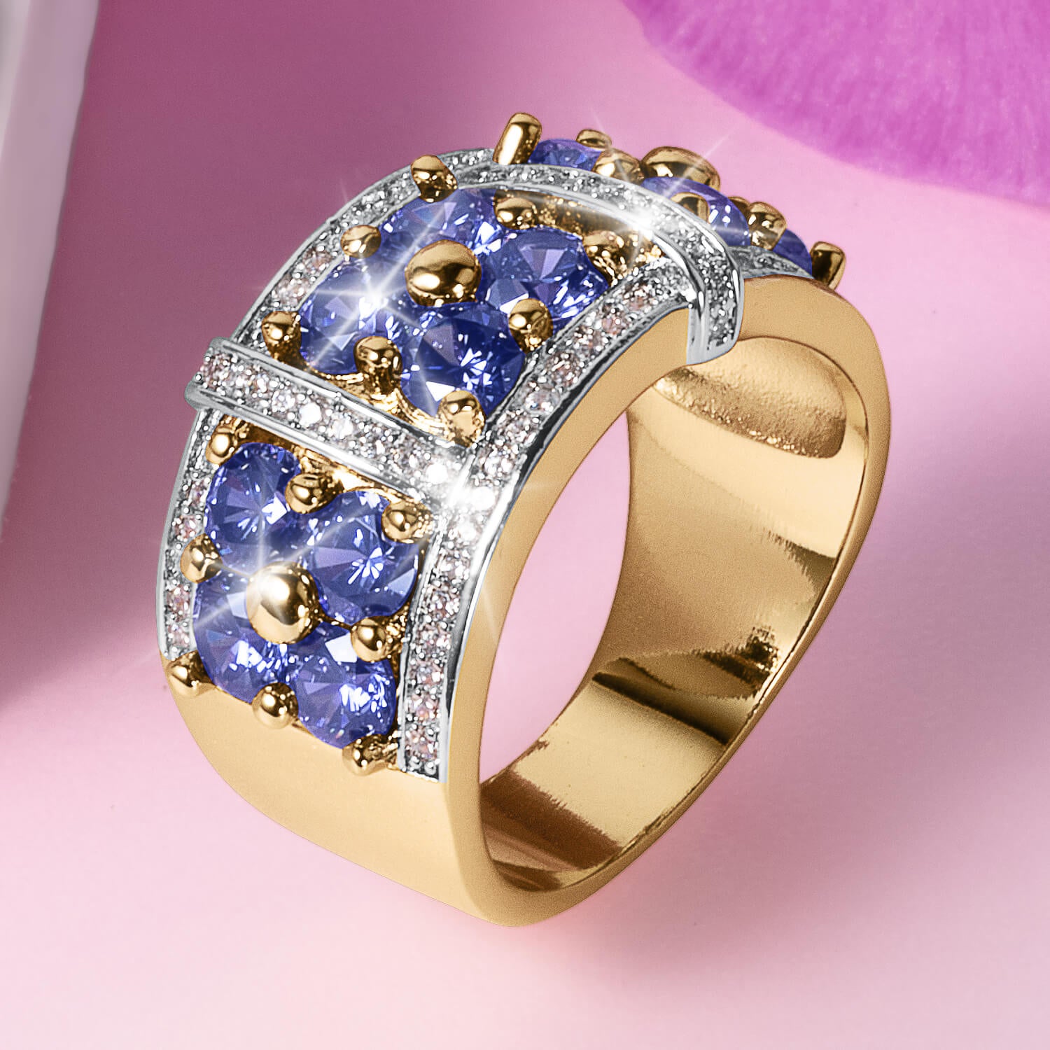 Show her how special she is with this stunning anniversary band. Finely crafted from sterling silver and finished in rich yellow gold, it showcases shimmering Diamondeau®, flawless simulated diamonds, in a captivating sea blue. This breathtaking band is a perfect way to celebrate your shared memories and the adventures still to come.