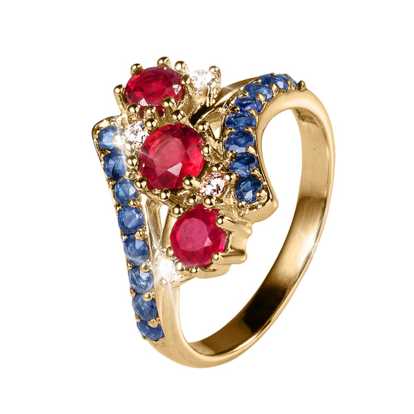 This ring is the perfect choice for a beautiful addition to your jewelry collection. Exquisitely crafted from sterling silver, plated in 18k yellow gold this twisted mount holds 3 statement juicy red Rubies sat in the center, caught in a loving embrace of shimmering Sapphires. The fruit cocktail of cherries and berries harmoniously joined adds a pop of breathtaking sophistication to your outfit.