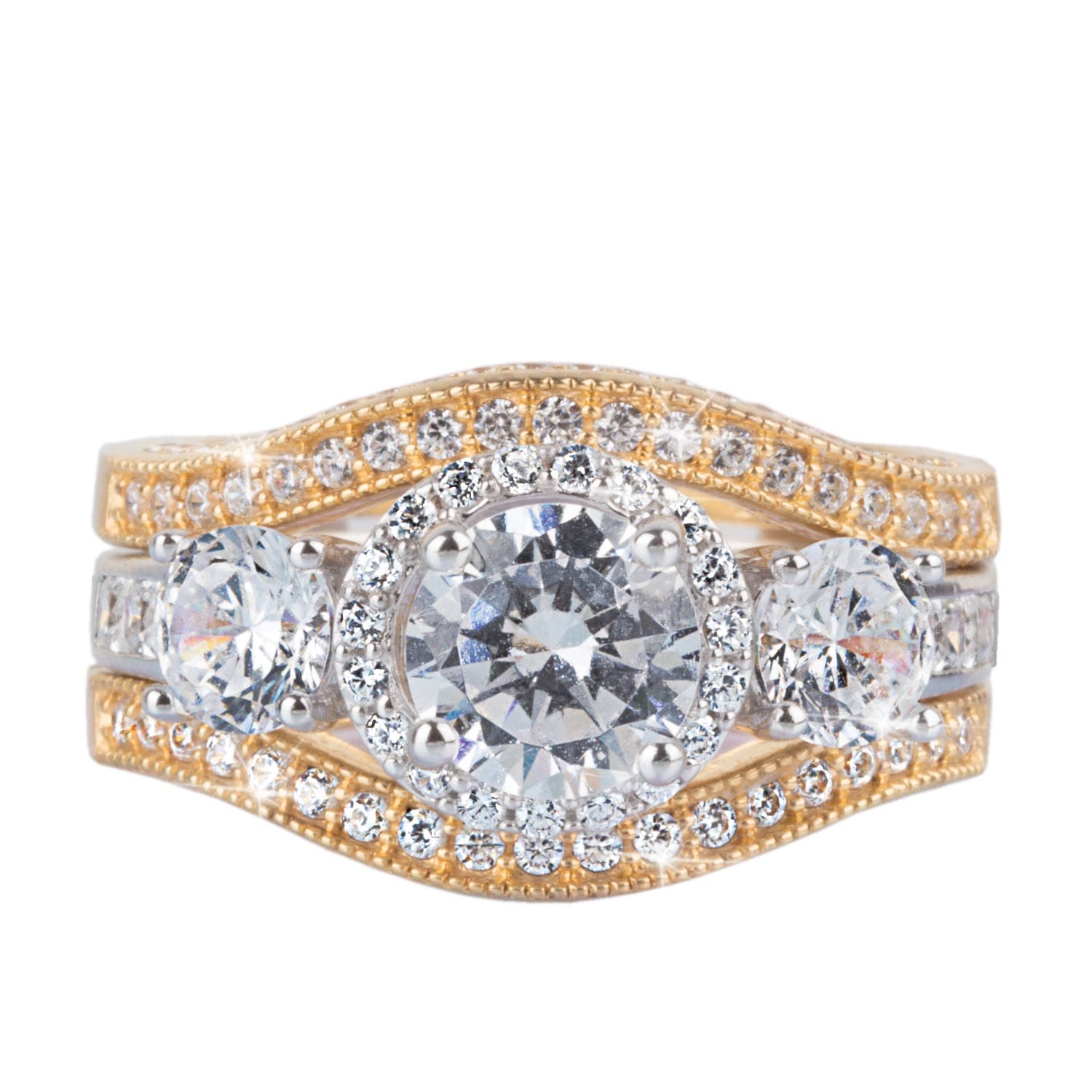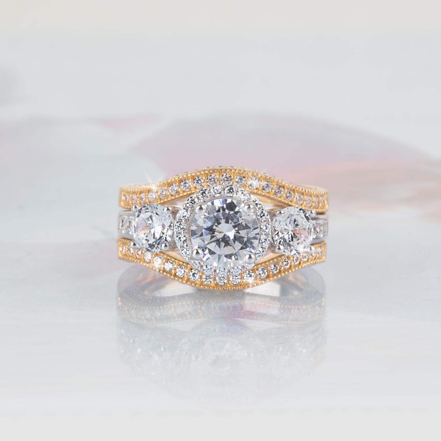 A classic trilogy ring is the starting point for this stylish duo combination. Sterling silver is plated with contemporary rhodium before being hand set with 2.46ct Diamondeau® - flawless simulated diamond. To add a dash of welcome flexibility we have created a matching sterling silver ring jacket studded with 82 brilliant cut Diamondeau® - flawless simulated diamond and lavishly plated in 18k yellow gold. Wear 1 of the rings or both together for different looks.