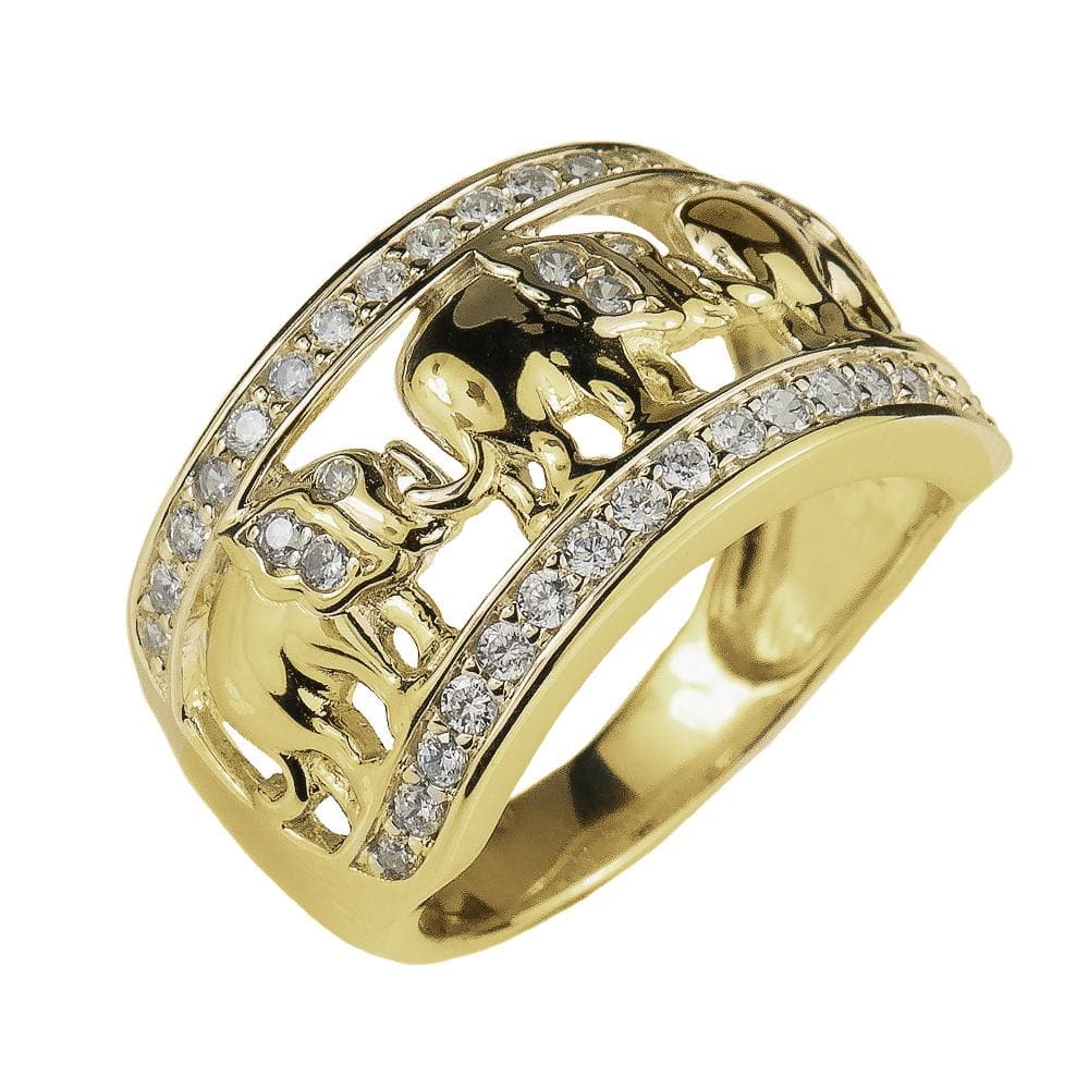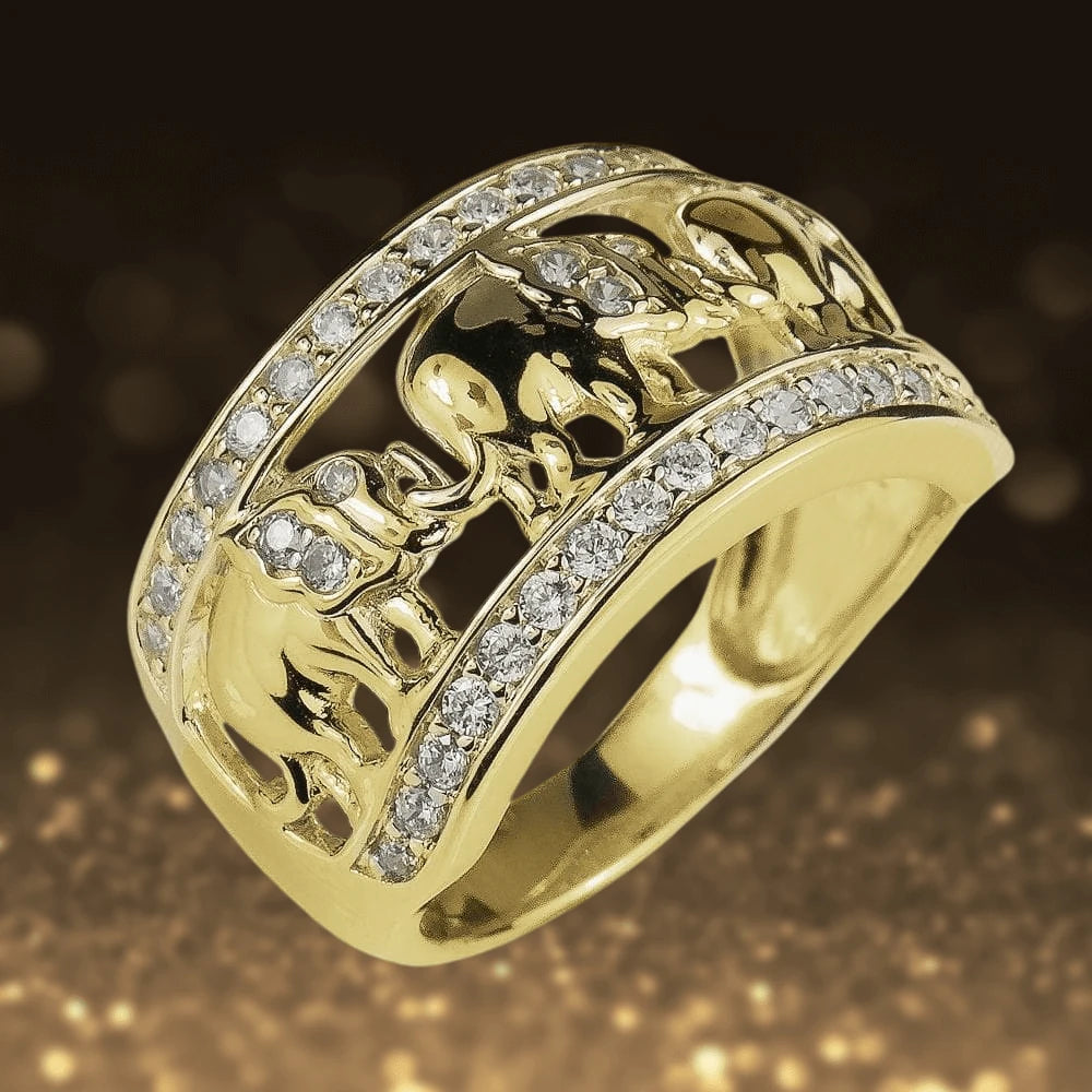 There is just something about Elephants that endear them to people. Perhaps it is their powerful presence or the fact they live for so long and are so family orientated. Indeed the family of Elephants on our new ring will last a lifetime if cared for properly. It has been lovingly created from 925 solid sterling silver lavishly plated with 18k yellow gold. Of course we couldn't resist adding a little sparkle with 36 of our flawless Diamondeau® - flawless simulated diamond. Magnificent presentation case.