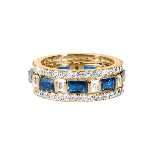 This spectacular set of rings is the ultimate symbol of commitment. 3 Unbroken circles of sparkling ice white and regal blue Diamondeau®, flawless simulated diamond, are the perfect metaphor for endless love. Expertly handset in the finest 925 sterling silver, plated in glorious yellow gold. The complete set contains over 4 carats of twinkling gems. Show her, she’s the one.