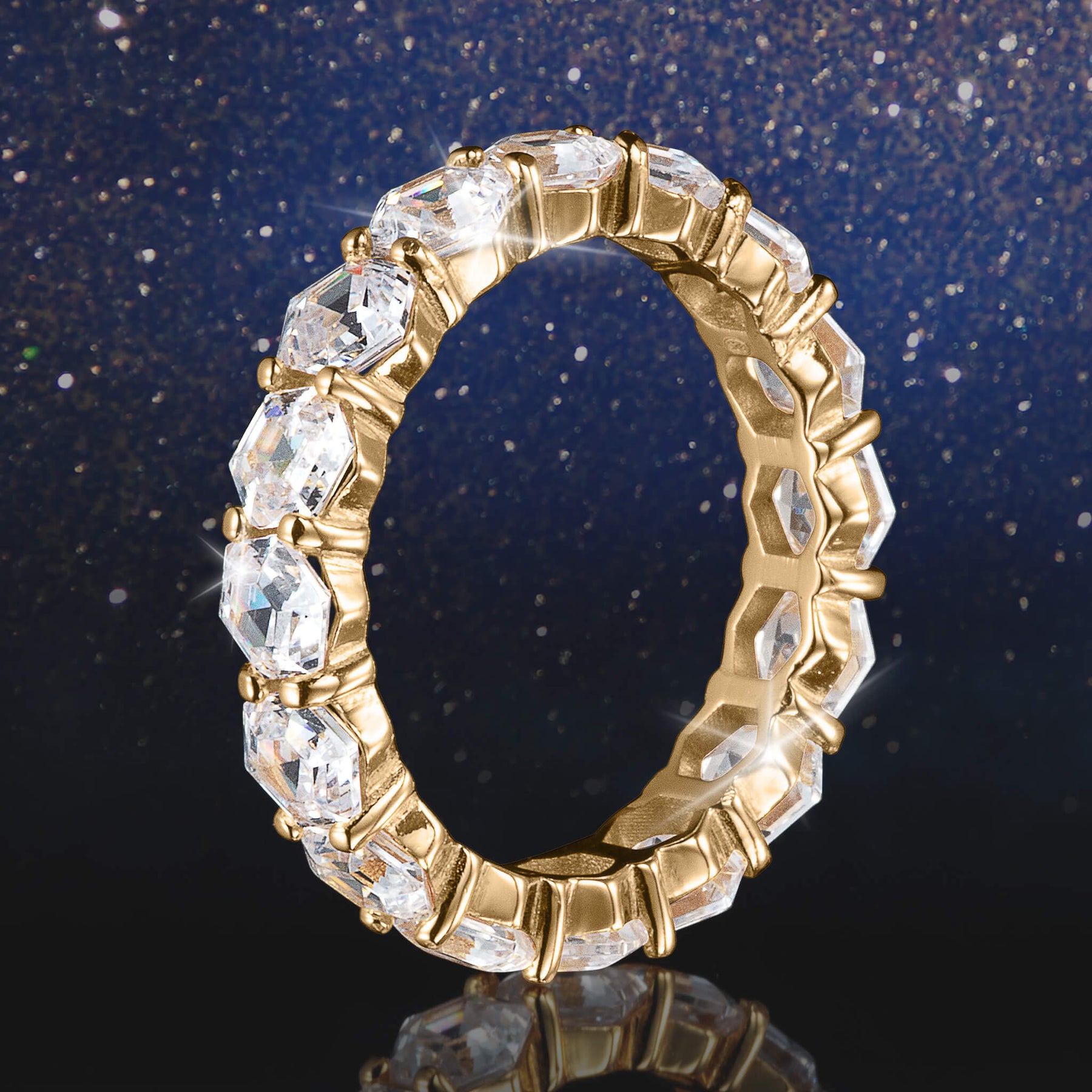 A symbol of eternal love and timeless elegance. Expertly crafted from sterling silver, finished in yellow gold radiating warmth and sophistication. A mesmerizing display of sparkling, hexagon cut Diamondeau®, flawless simulated diamond. Each fancy cut stone is set to create a dazzling array of light. Whether worn as a symbol of eternal commitment or simply as a statement piece, this ring is sure to turn heads and spark conversation wherever you go.