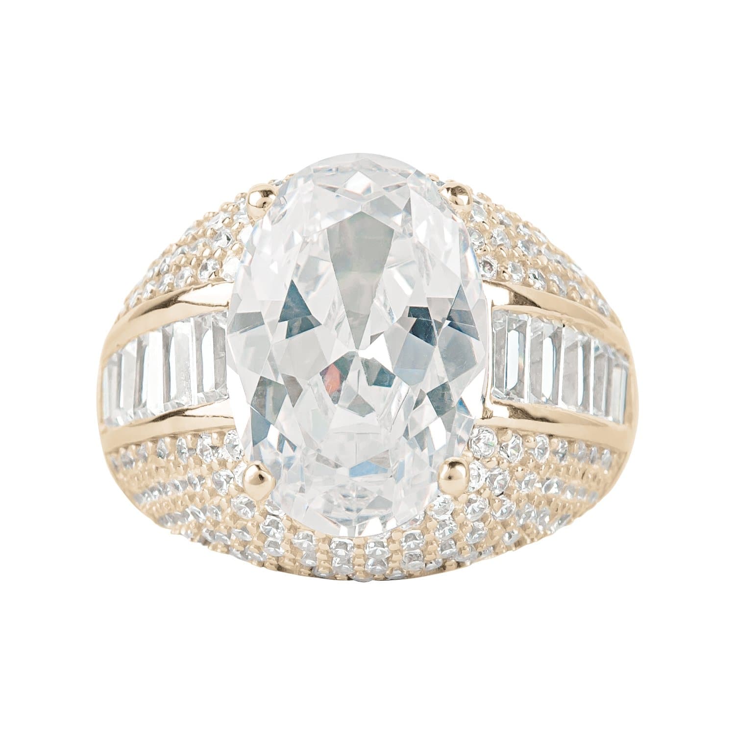 One of the most famous of diamonds is an oval cut gem, now part of the British Crown Jewels. The name of this diamond means "Mountain of Light" – the Koh-I-Noor. Its history dates back to 1304, the longest of all famous diamonds. There is an alleged curse on the Kohinoor that affects males who wear it (but females are immune). Since being in the possession of Queen Victoria, only women wore the diamond. You will have no curses with this stunning ring inspired by the beauty and grandiose of the Koh-I-Noor. 9.38ct carats of shimmering Diamondeau® - flawless simulated diamond handset in an 18k yellow gold plated sterling silver mount. A perfect gift to show your love.