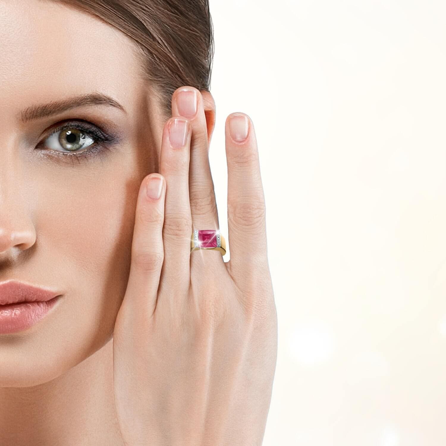 In ancient languages "Ruby" means "King of Gems". Top quality rubies can cost more carat for carat than flawless diamonds. We wanted to bring you these stunning gems at an outstanding price. A striking sterling silver collection of earrings, pendant and ring is plated in luxurious yellow gold. A princess cut, solitaire takes pride of place in each piece, flanked either side by more shimmering gems. Ruby is the birthstone for July making this the ideal gift for an upcoming birthday.