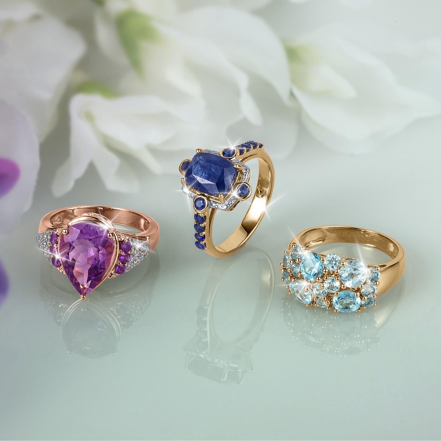 Discover a splash of color with our “summer cocktail ladies rings” that will certainly please. The mounts are expertly crafted from sterling silver and finished in 18k yellow or rose gold. A style to match all tastes, choose from an Art Deco styling with a stunning Sapphire center stone and Sapphire shoulders. A band style with different shimmering shades of Sky and Swiss Blue Topaz, creating a gorgeous contrast of color. A stunning pear Amethyst with sparkling detailed shoulders. Originality is expressed in every piece.