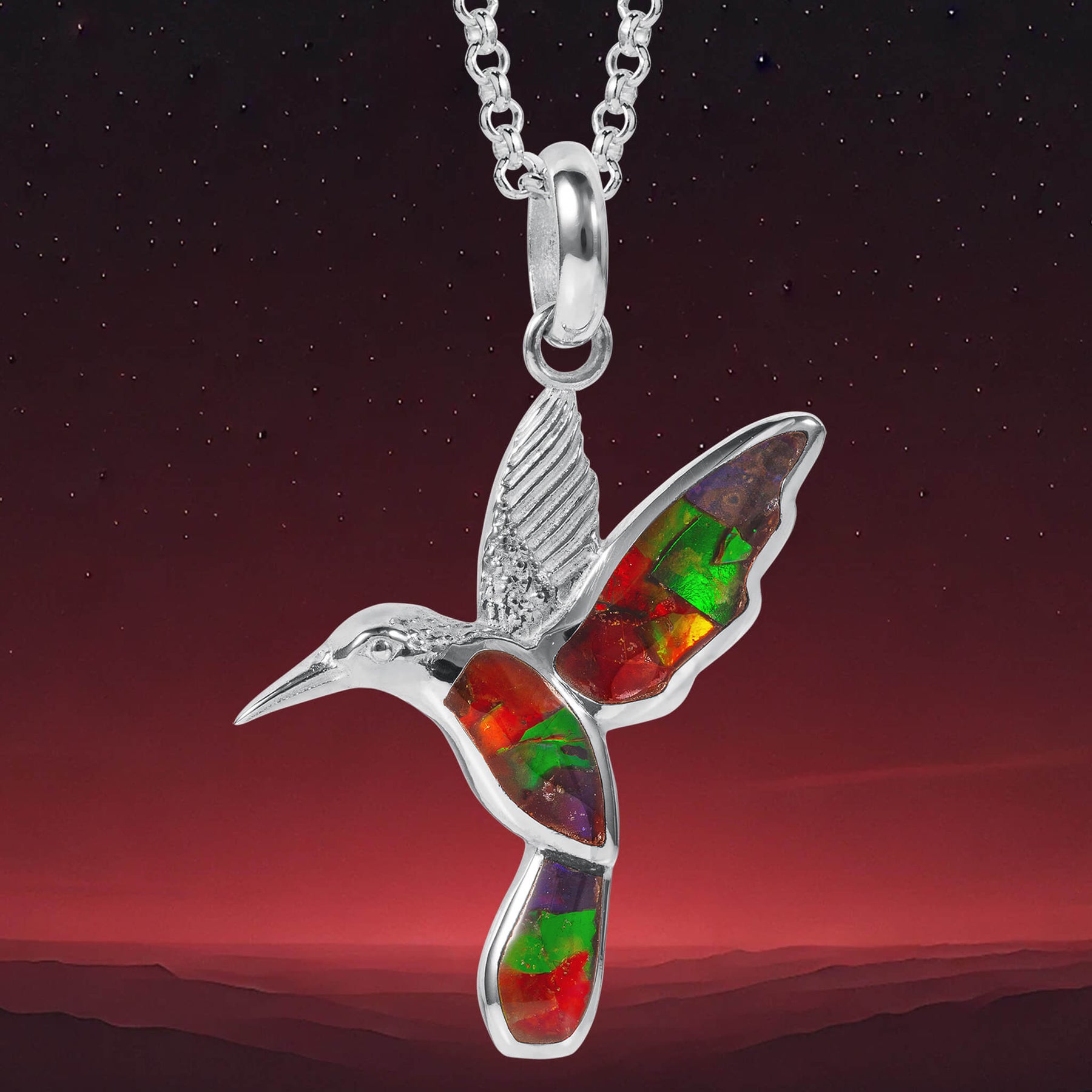 Experience the captivating beauty of nature with our exquisite Ammolite Hummingbird jewelry. This stunning pendant with chain features an enchanting hummingbird design. Made with high-quality sterling silver, the hummingbirds are adorned with vibrant ammolite inlays that shimmer with an array of colors, reminiscent of a magical tropical garden. Perfect for any occasion, whether it's a casual day out or a formal evening event, this piece will undoubtedly become a cherished addition to your jewelry repertoire. Embrace the elegance of nature and let your style take flight.