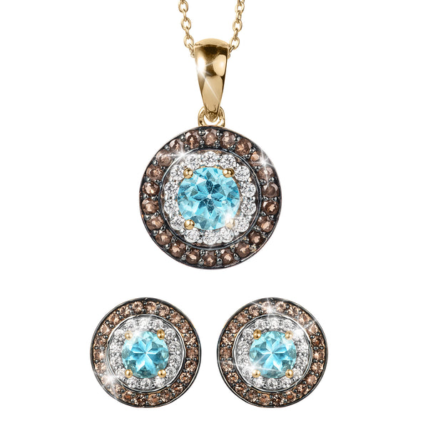 Introducing the timeless beauty of our Blue Topaz Horizon Collection, crafted from the finest sterling silver, finished in 18k yellow gold, featuring a stunning blue topaz stone at the center. The blue topaz radiates a calming oceanic aura, surrounded by a halo of sparkling white Diamondeau®, flawless simulated diamond, adding a touch of sophistication. A second halo of brown shimmering gems with a black rhodium finish, adds an extra layer of glamor to this exquisite piece. This collection is a versatile design making it suitable for any occasion.