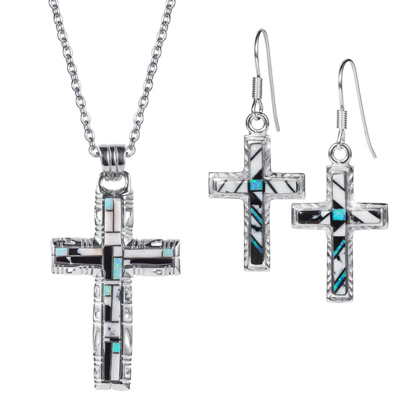 Crafted from sterling silver, this set features a cross pendant and matching earrings, each inlaid with the spiritual stone White Buffalo. This standout black and white stone was first discovered in the Dry Creek Mine, Tonopah, Nevada by the Otteson family in 1993. Symbolizing purity, strength and spirituality, White Buffalo stone adds a unique and meaningful touch to this set.