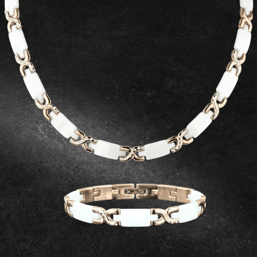 This gorgeous necklace is sculpted so that it sit elegantly on your neck in a graceful circle. Overlapping crosses set with our flawless Diamondeau® - flawless simulated diamond. are crafted from solid stainless steel lavishly fused with rose gold which are then interspersed with highly polished panels of white ceramic. We definitely recommend you add the 7.5" matching bracelet to your 18" necklace order.