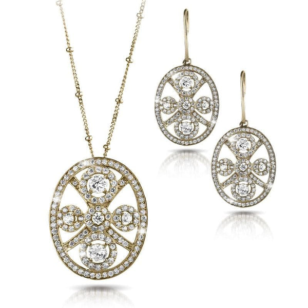 Art Deco is where our designers gave creativeness for this collection, it is a style defined as an assertively modern style, ran to symmetry rather than asymmetry. During its heyday, Art Deco represented luxury, glamour and exuberance. These are qualities exhibited here. Crafted from sterling silver finished in gold, over 111 Diamondeau® - flawless simulated diamond in the pendant, over 200 Diamondeau® - flawless simulated diamond in the earrings, a real example of glamour.