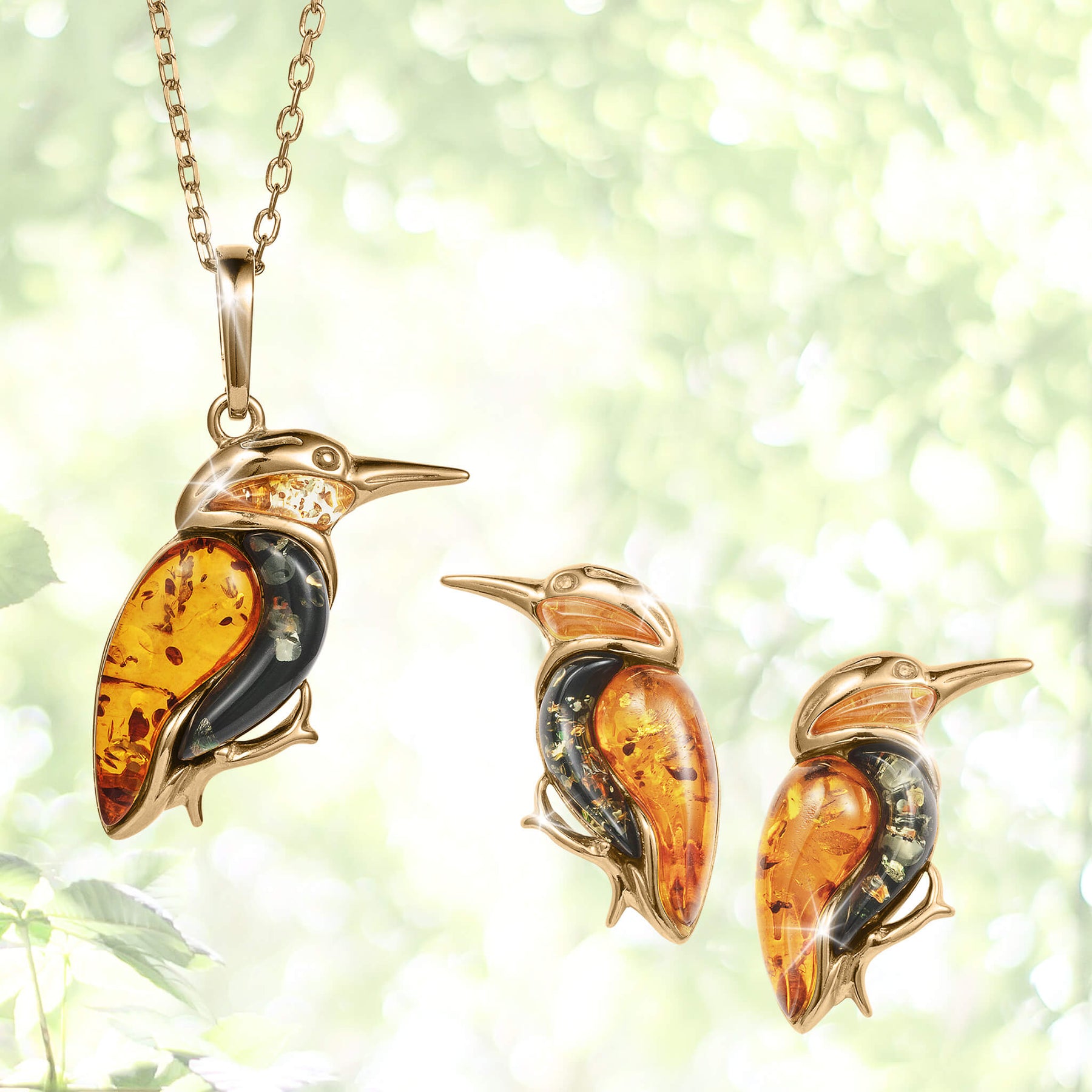 A standout set meticulously crafted from sterling silver and finished in lustrous 18k yellow gold. The body of each piece is inlaid and adorned with the striking beauty of lemon, green & cognac Amber, creating a captivating display of colors reminiscent of a vibrant sunset over tranquil waters. Embrace the beauty of nature with this set that is sure to captivate attention and inspire admiration