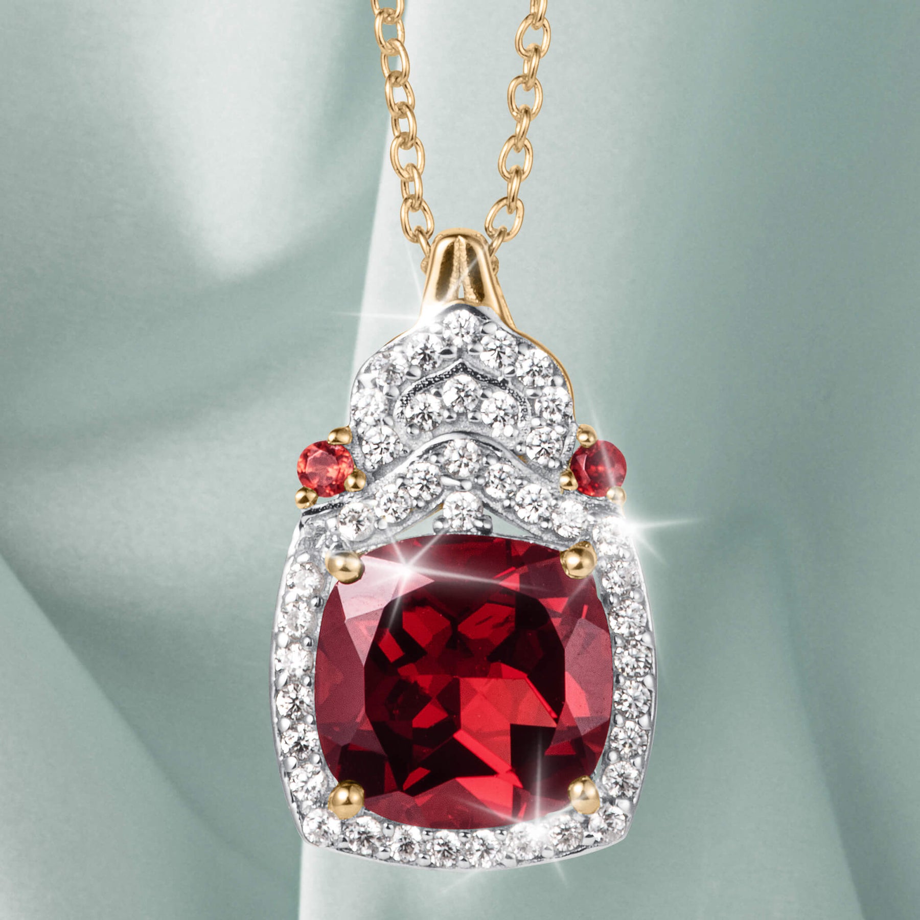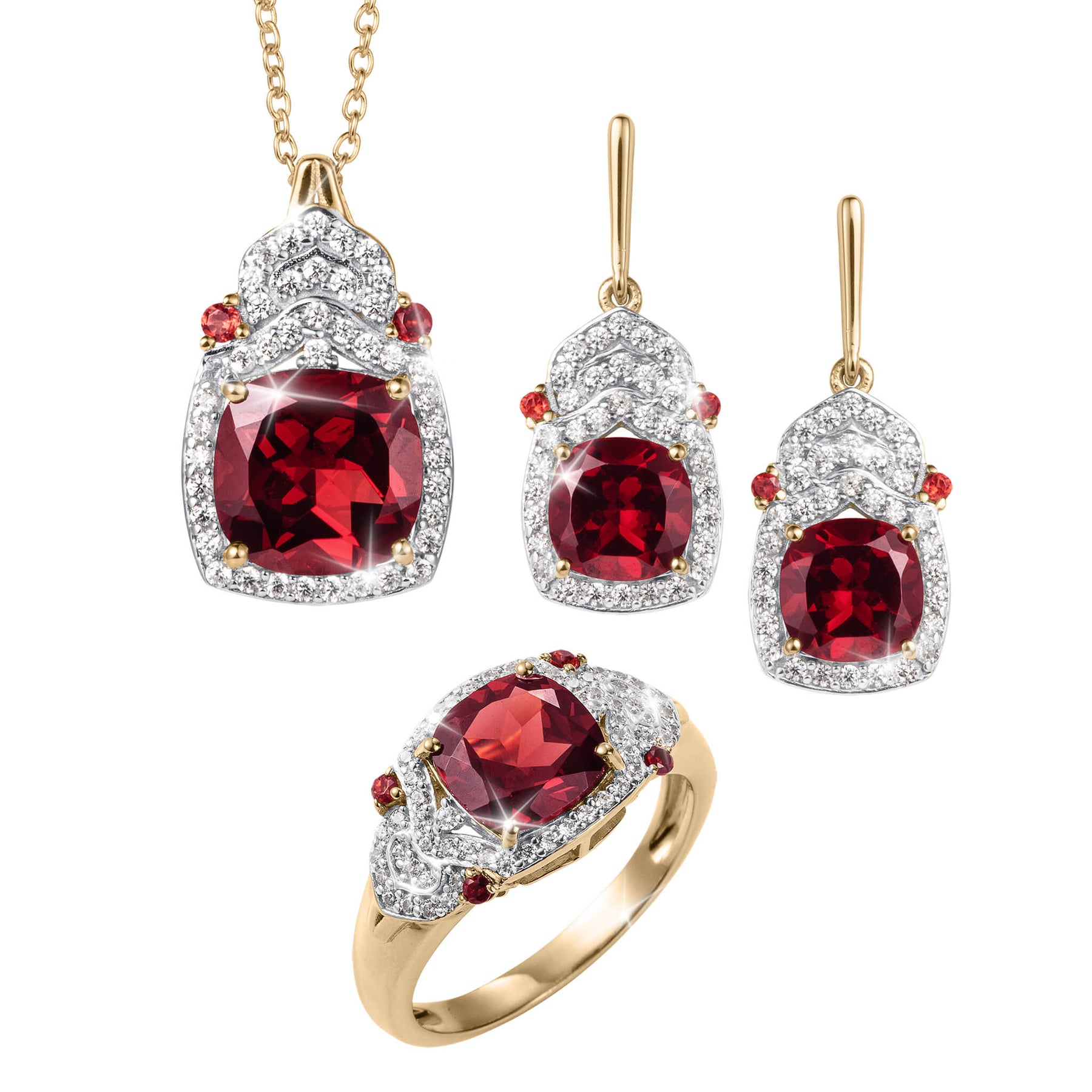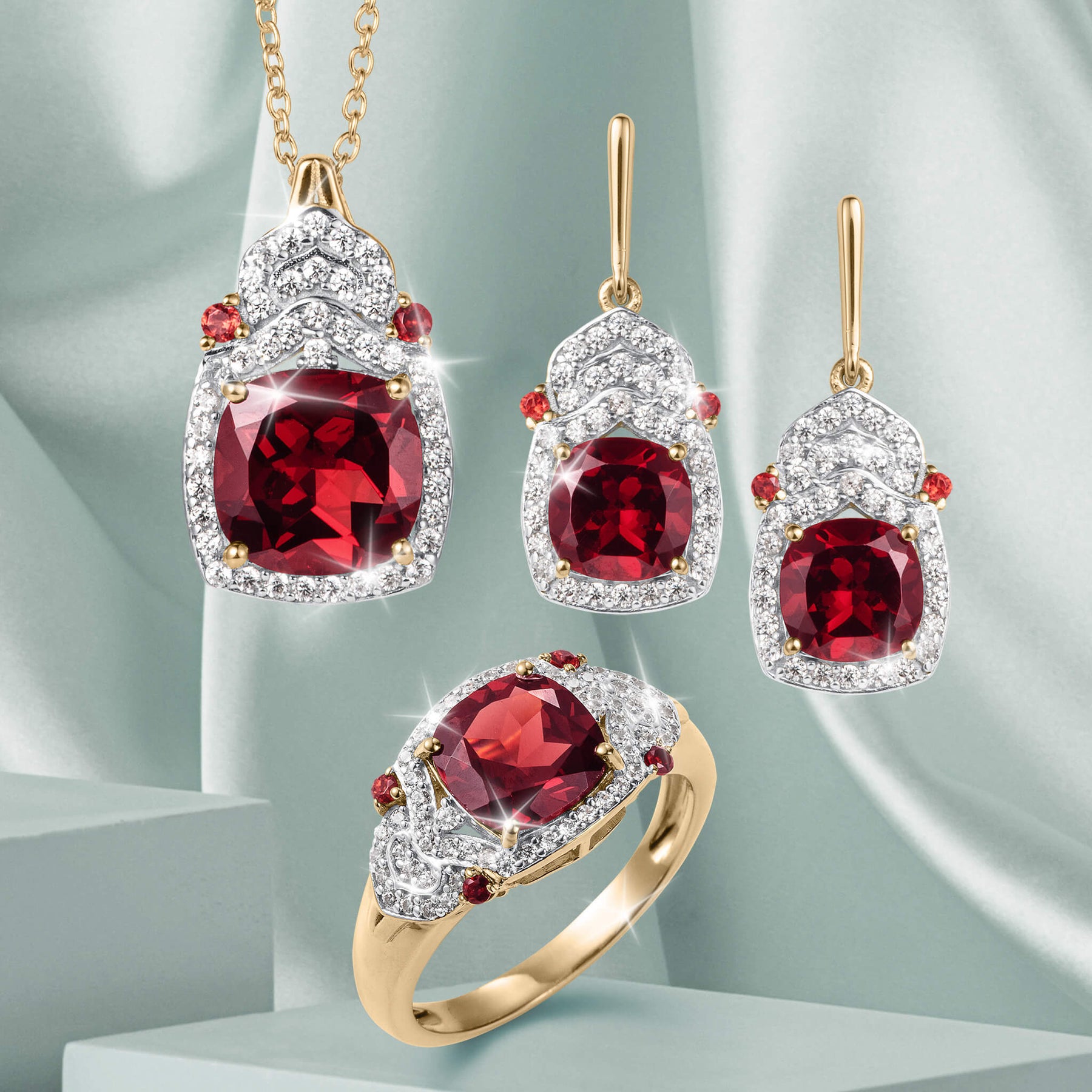 This jewelry set, consisting of a pendant, earrings, and a ring, is crafted with exceptional attention to detail. The collection features captivating Garnet gemstones which are renowned for their deep, rich red color. An exquisite cushion-cut Garnet sits at the center of each graceful sterling silver setting, complete with a warm yellow gold finish. Each piece is framed by a radiant halo of sparkling DiamondeauĀ®, a simulated gemstone qualifier, that adds to the elegance of the set.Ā Garnets have been cherished for centuries because they symbolize passion, strength, and vitality. Known for their striking hue and durability, they are not only beautiful but also versatile, making this set a perfect choice for any occasion. Whether you're dressing up for a special event or adding a touch of grace to your daily look, these pieces exude beauty and sophistication.