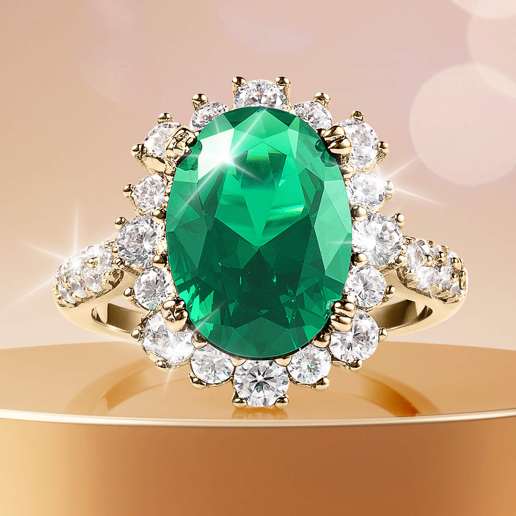 This collection is a true testament to timeless elegance and refined craftsmanship. Meticulously fashioned from sterling silver and flawlessly finished in radiant yellow gold. The pendant, earring and ring are designed to captivate and leave a lasting impression. At the heart of each piece lies a magnificent deep green Diamondeau®, flawless simulated diamond, chosen for its vibrant allure and captivating hue, with a dazzling halo of ice white gems. This set will undoubtedly elevate your ensemble to new heights of sophistication.