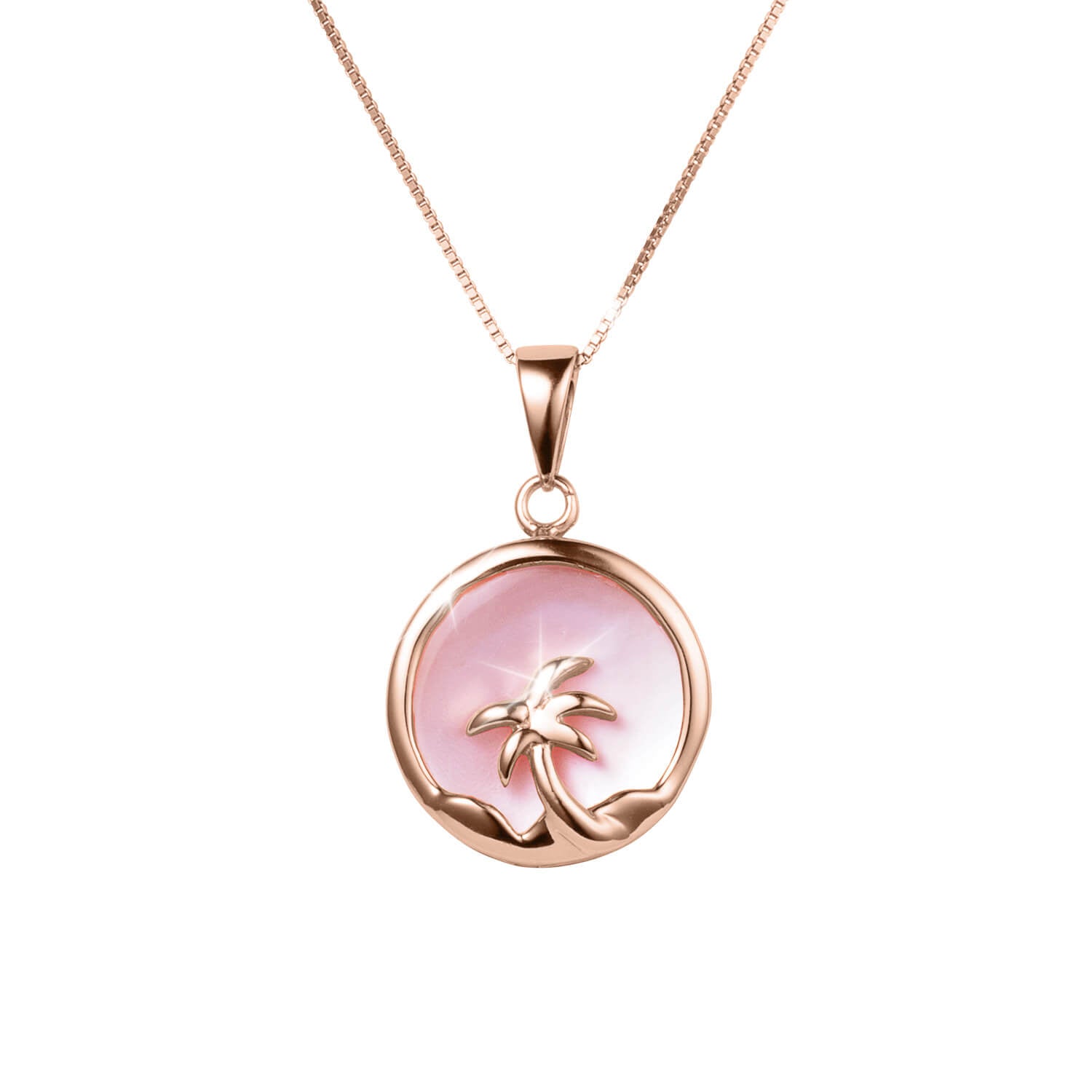 This beautiful collection captures the tropical elegance of the island life. Nature and style come together with this contemporary design. A sterling silver mount has been finished in rose gold with a stunning pink, mother of pearl in the center. Sat on top is a rose gold palm tree. Whether you are at the beach or on vacation, this piece will never go out of style!