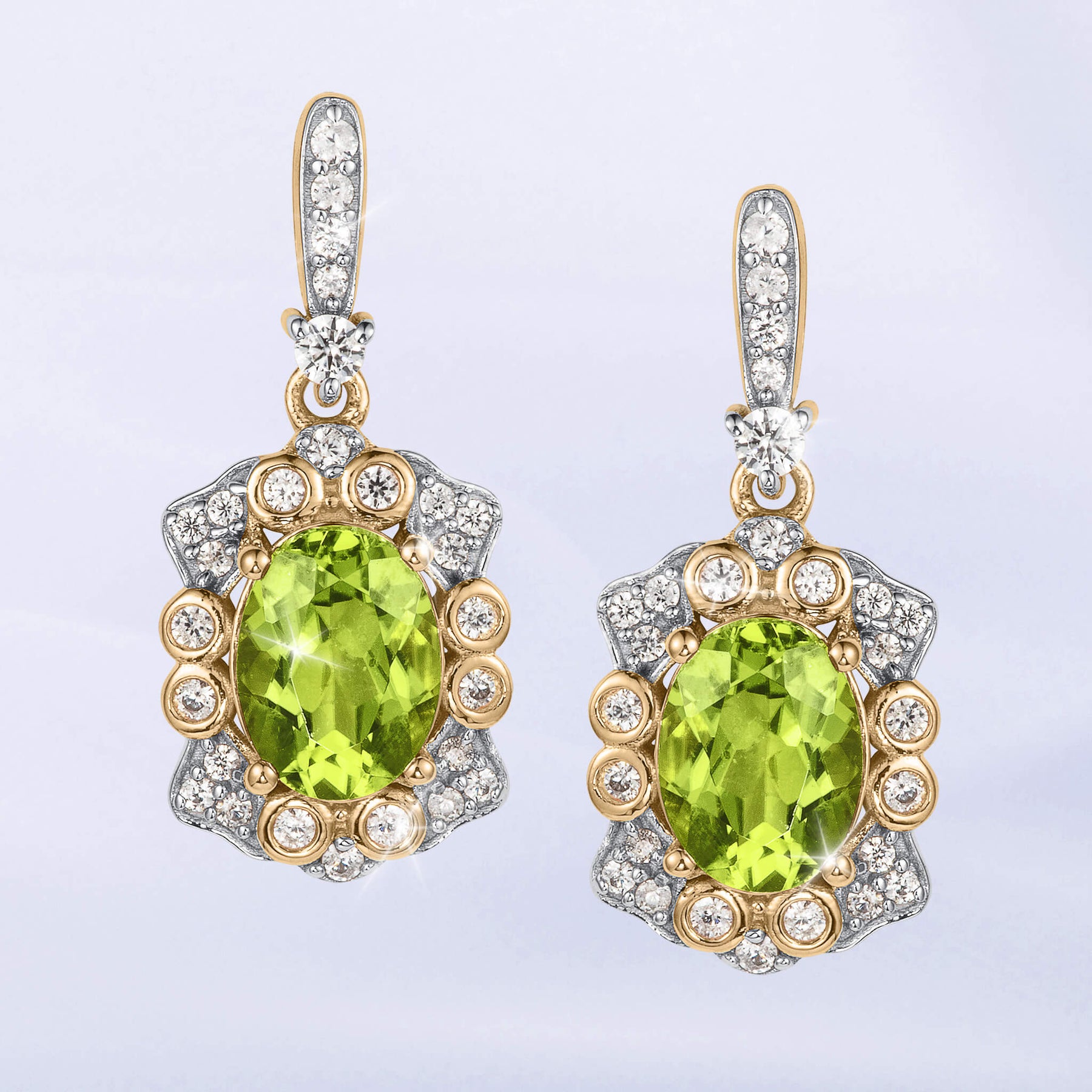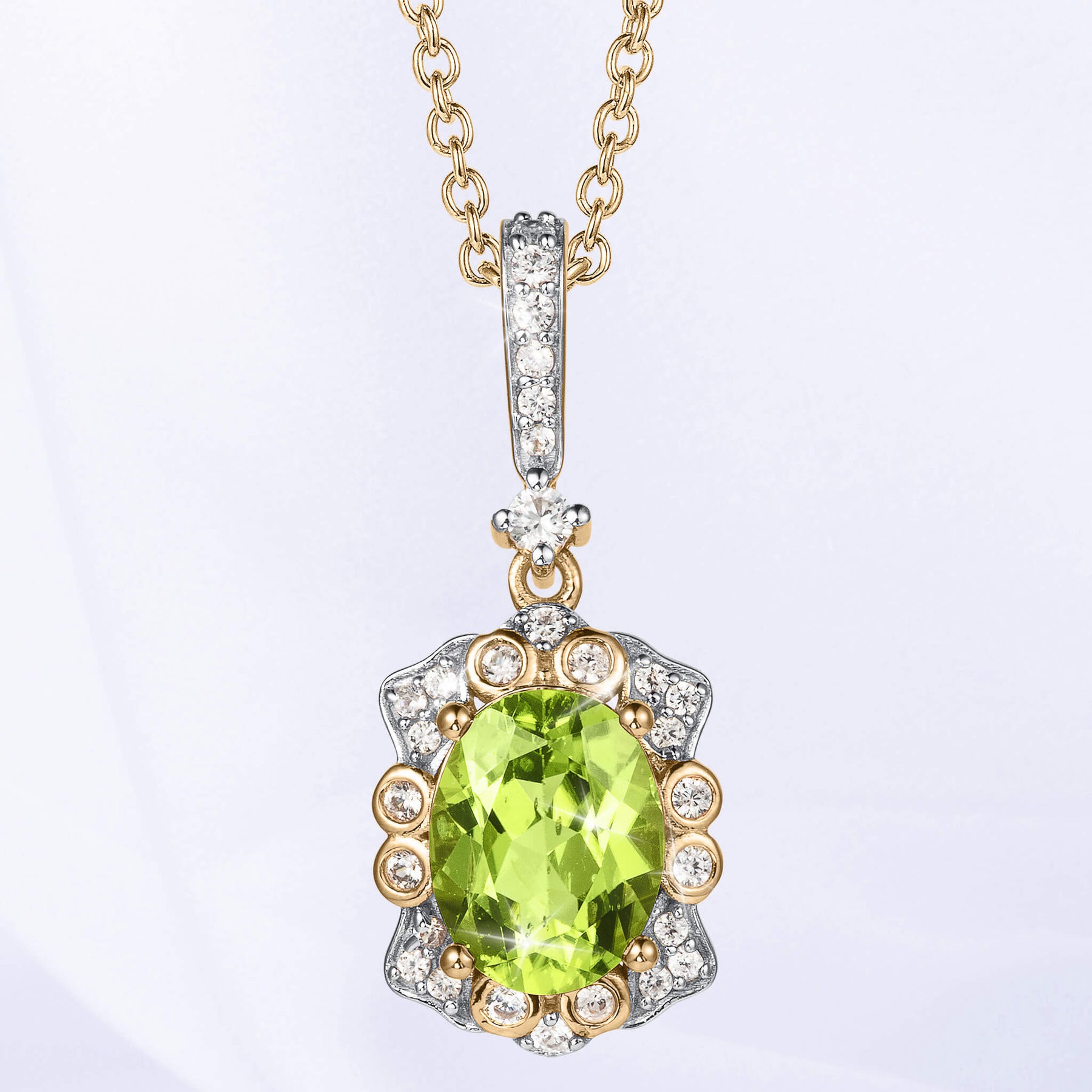 This stunning collection features a pendant, earrings and ring, each meticulously crafted from sterling silver and finished with an opulent 18k two tone finish. At the heart of each piece lies a captivating oval Peridot, renowned for its vibrant green hue. This enchanting gemstone is beautifully complemented by shimmering white Diamondeau®, flawless simulated diamond. Each piece stands alone as a statement of beauty and together, they create a cohesive look that is both timeless and modern. An ideal gift for an August birthday.