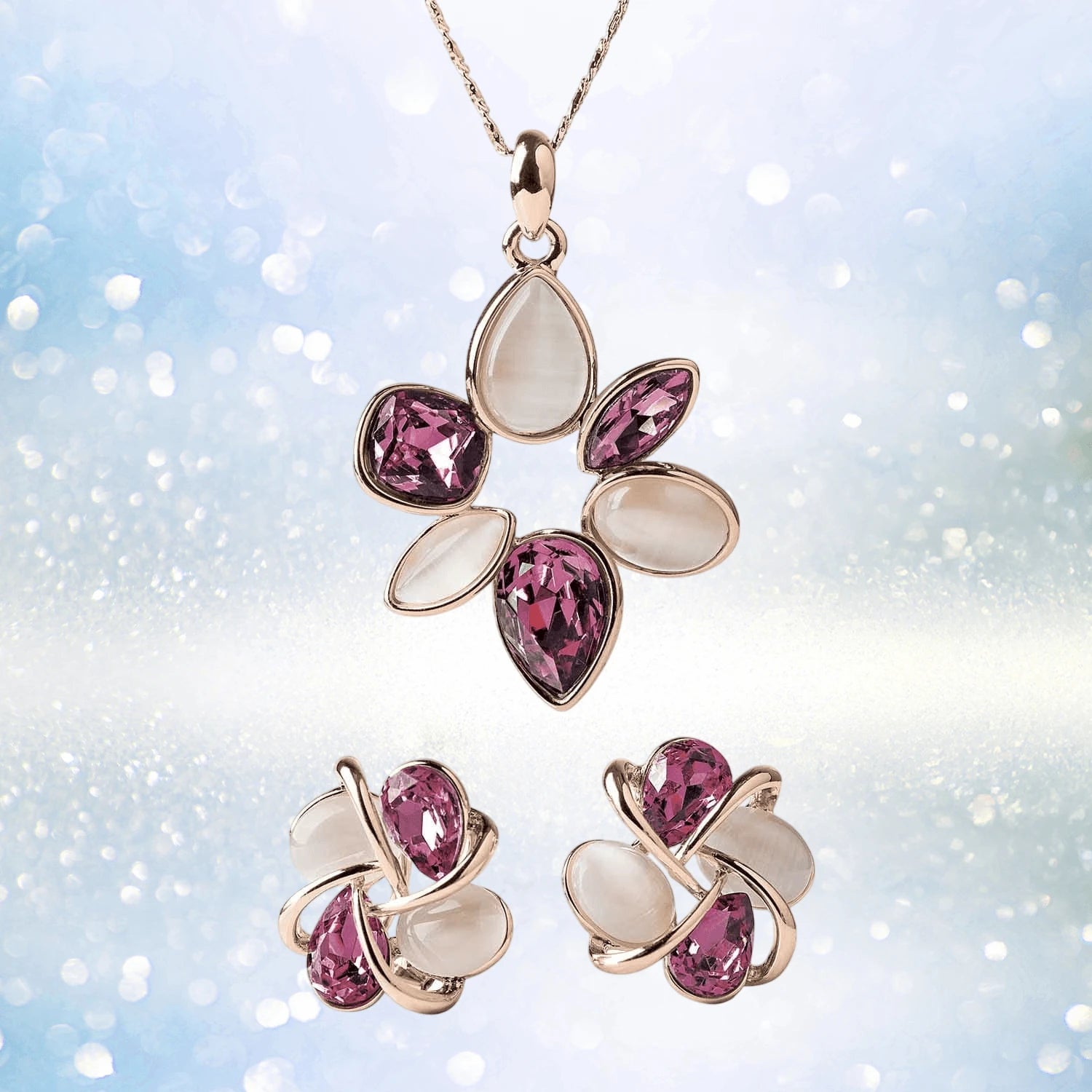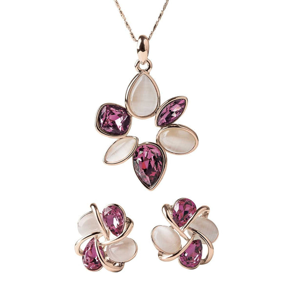 You will be sure to be completely captivated by this stunning masterpiece. The mixture of pear-shape, princess cuts, marquise and oval cuts add a vibrant intrigue. Available in luxurious rose or yellow gold plated finishes; in either necklace or earrings buy together for a great cost saving.