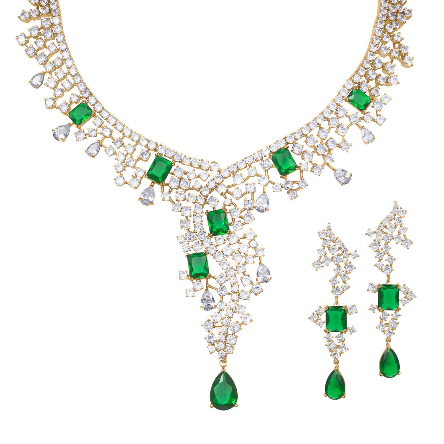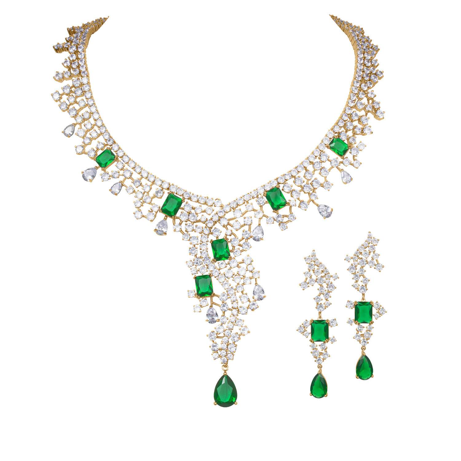 This gorgeous collection is bursting with vibrant green color. Each teardrop, emerald and brilliant round stone is of our signature Diamondeau® - flawless simulated diamond. This statement set is absolutely breathtaking, all finished in luxurious yellow gold, making it a perfect complement to any outfit.