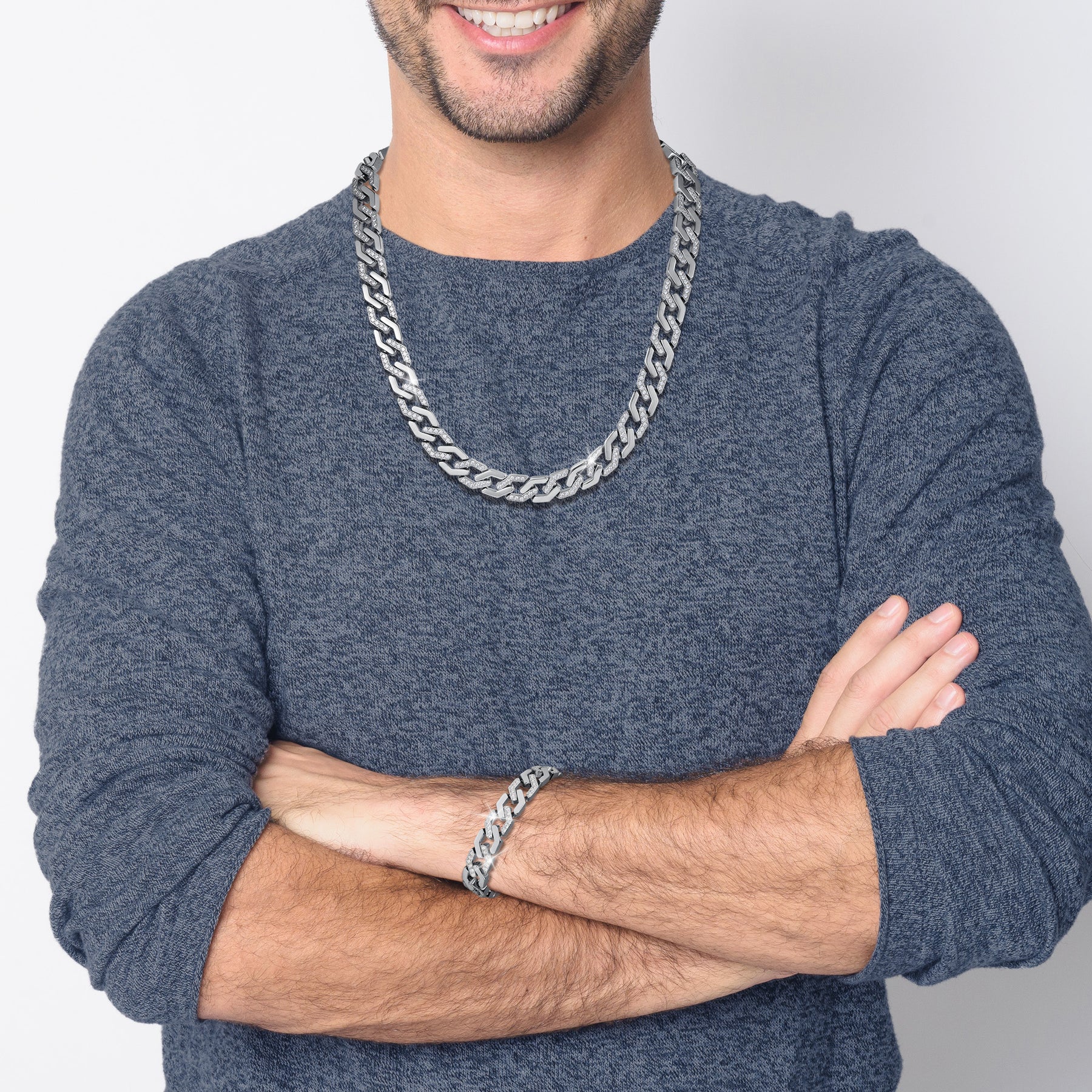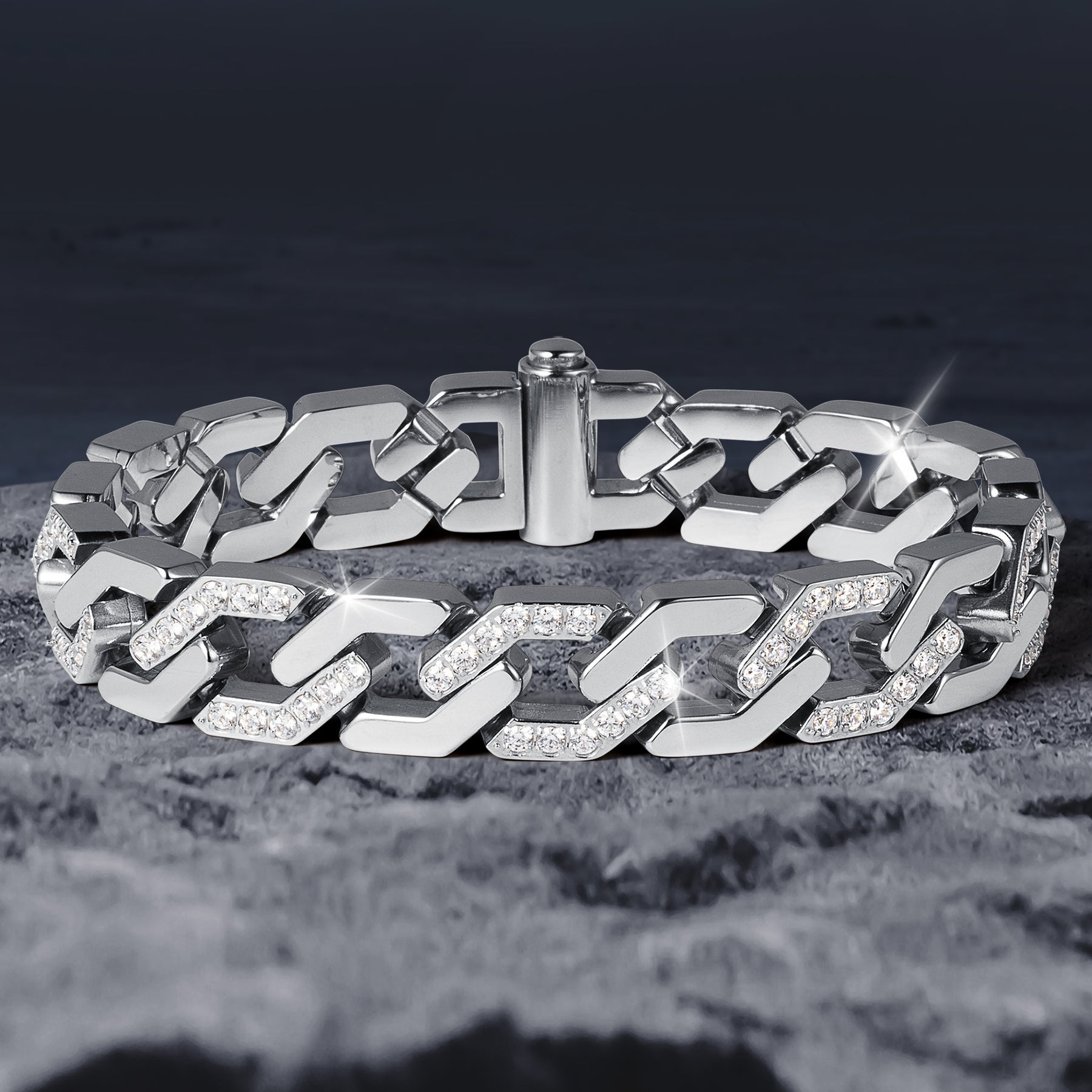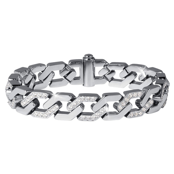 A bracelet that redefines luxury with its exquisite design. This meticulously crafted men's bracelet is made from premium grade stainless steel that imparts a sleek, modern aesthetic that complements any ensemble. What sets these pieces apart are the alternating links adorned with ice white Diamondeau®, flawless simulated diamond, adding a touch of opulence and brilliance to the ensemble. Whether you’re dressing up for a special occasion or simply looking to make a statement in your everyday style, this bracelet is the perfect choice.