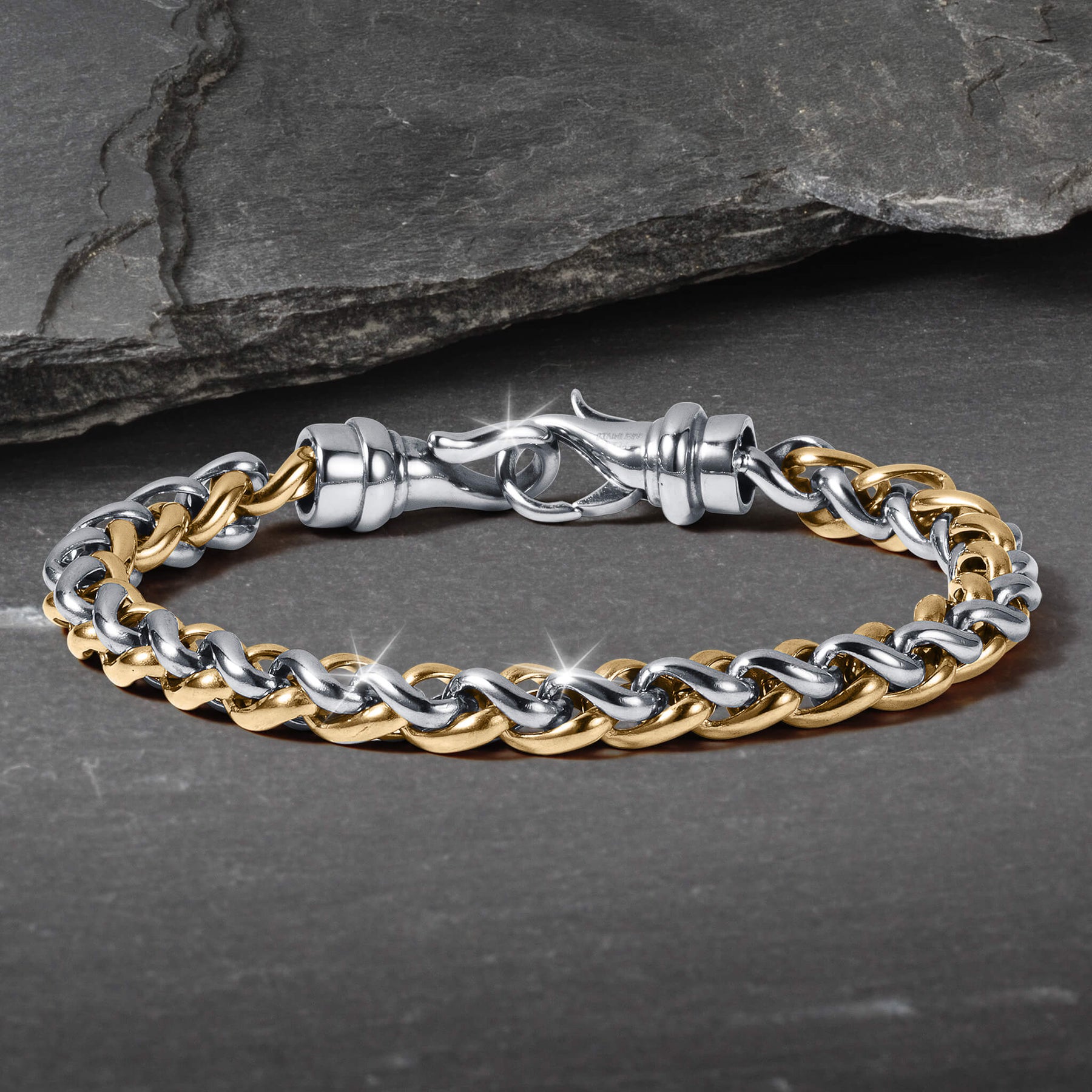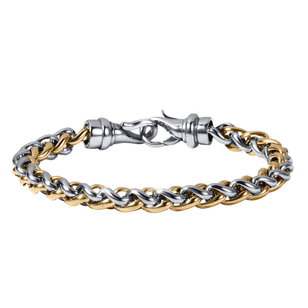 A distinguished men’s Spiga bracelet designed to elevate your style. Crafted with precision from premium grade stainless steel with a striking two tone finish. The combination of sleek steel and warm gold tones creates a captivating contrast that catches the eye and sets you apart from the crowd. This exquisite bracelet features an intricate chain designed to elevate your style and make a bold statement.